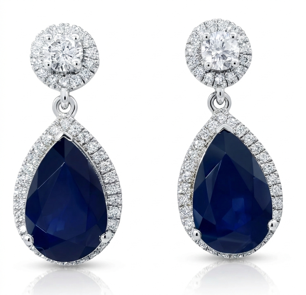 Introducing our Limited Edition 18K White Gold Diamond and Sapphire Earrings, a stunning addition to our exclusive Sapphire, Precious Birthstone, and Red Carpet Collections. Each earring showcases a vibrant pear-shaped sapphire, measuring 11x7mm, elegantly surrounded by meticulously set sparkling diamonds for unparalleled brilliance. Crafted from lustrous 18K white gold, these earrings embody sophistication and exquisite craftsmanship. Ideal for special occasions or as a timeless heirloom, this limited edition piece celebrates the elegance and allure of the precious sapphire, making it a perfect gift or personal treasure. Elevate your collection with these extraordinary earrings—where luxury meets artistry.