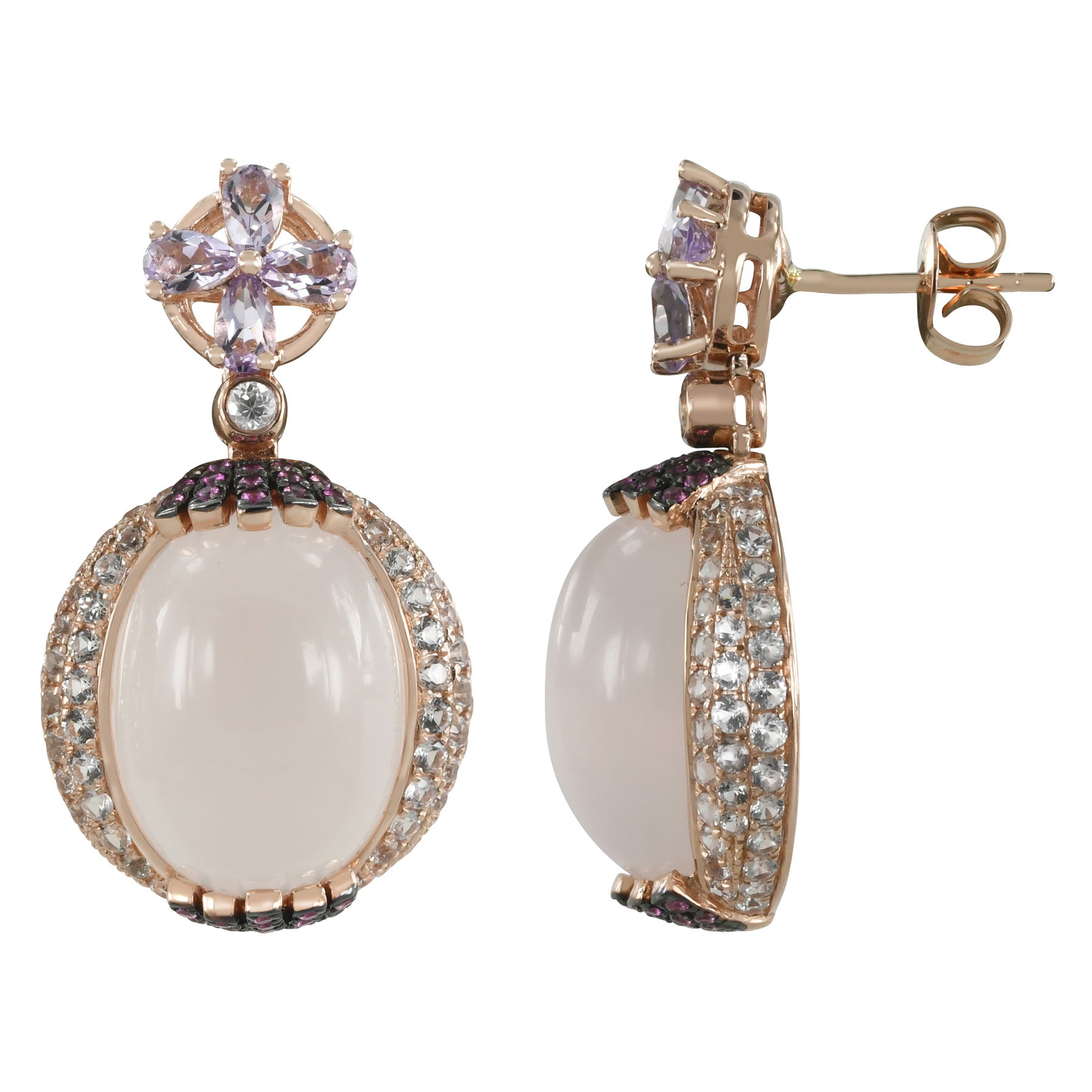 14K ROSE GOLD WHITE SAPPHIRE, PINK SAPPHIRE AND ROSE QUARTZ EARRING