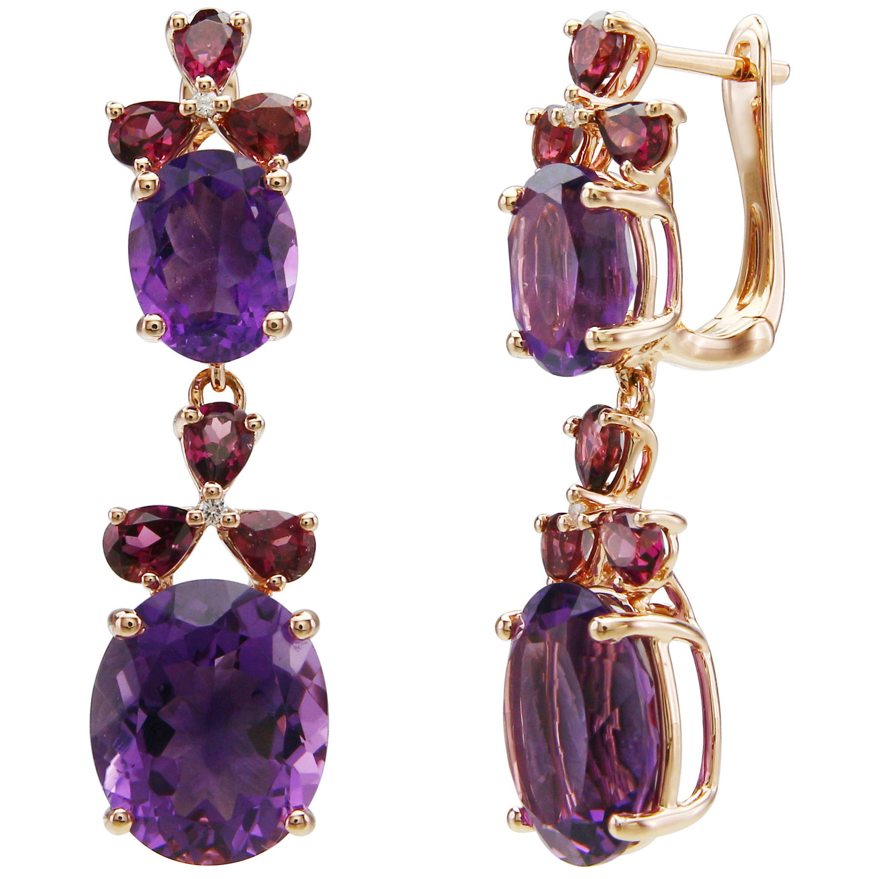 Elevate your elegance with these Limited Edition 14K Rose Gold Earrings from the Amethyst Collection. Exquisitely crafted, each earring features a luminous 12x10mm oval amethyst, highlighted by vibrant rhodolite accents and sparkling diamond details. The warm blush of 14K rose gold perfectly complements the luscious hues of the gemstones, offering a sophisticated yet contemporary touch. Designed for those who appreciate unique luxury, these earrings are a rare and timeless treasure.