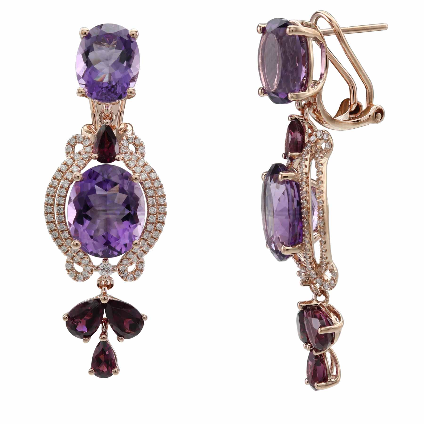 14K ROSE GOLD DIAMOND, RHODOLITE AND AMETHYST EARRING