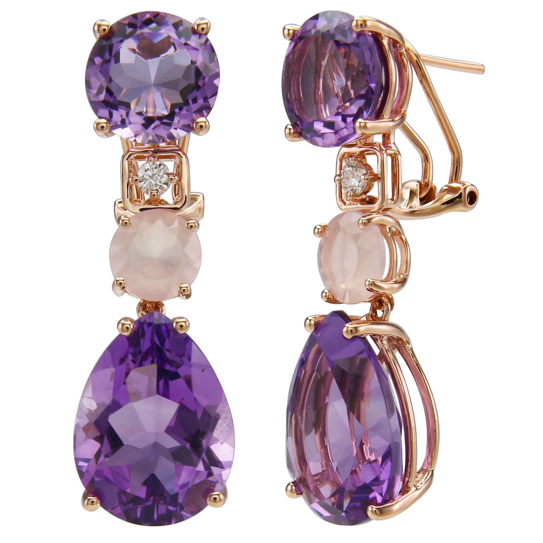 14K ROSE GOLD DIAMOND, ROSE QUARTZ AND AMETHYST EARRING