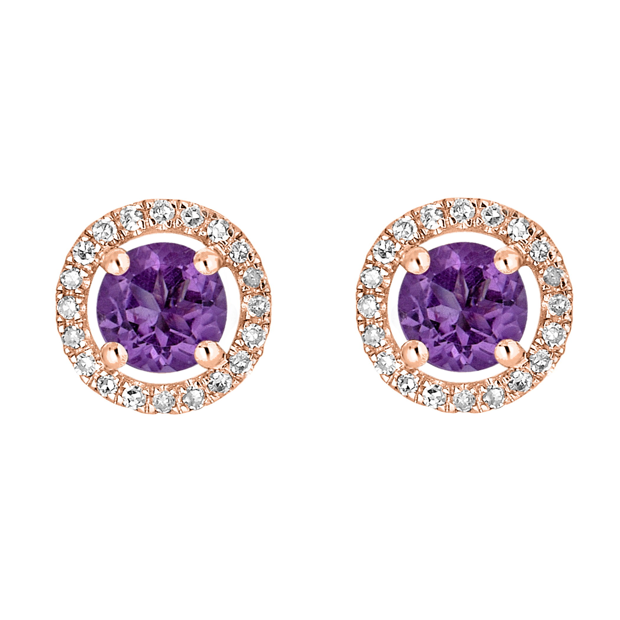 Radiant amethyst accented with dazzling diamonds in these luxurious rose gold earrings.• 4mm Round Amethyst• 14K Rose Gold Setting• Diamond Accents• Secure Backings• Semi Precious Birthstone Collection