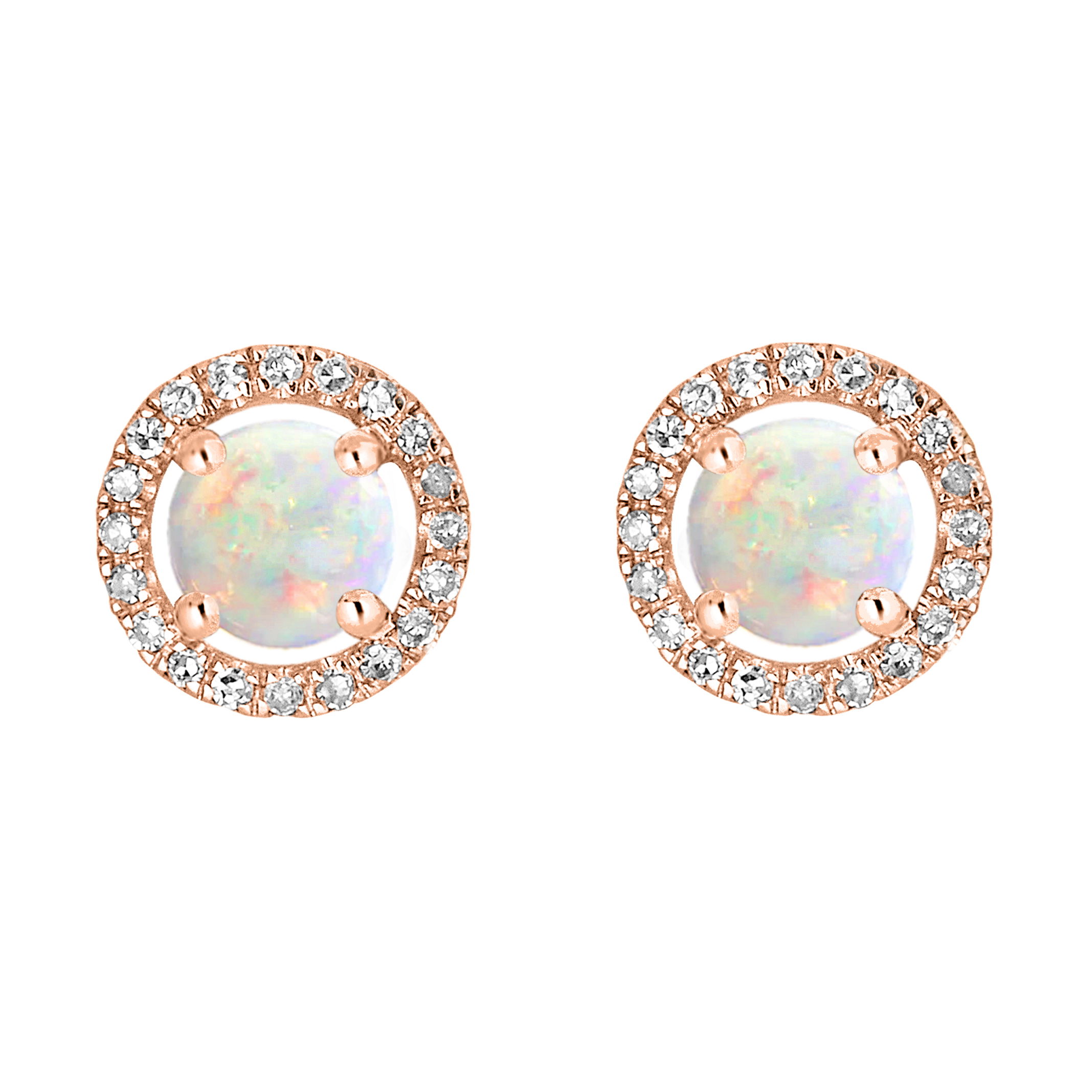 Shining Australian opals accented with dazzling diamonds in these luxurious rose gold earrings.• 4mm Round Australian Opal• 14K Rose Gold Setting• Diamond Accents• Secure Backings• Semi Precious Birthstone Collection
