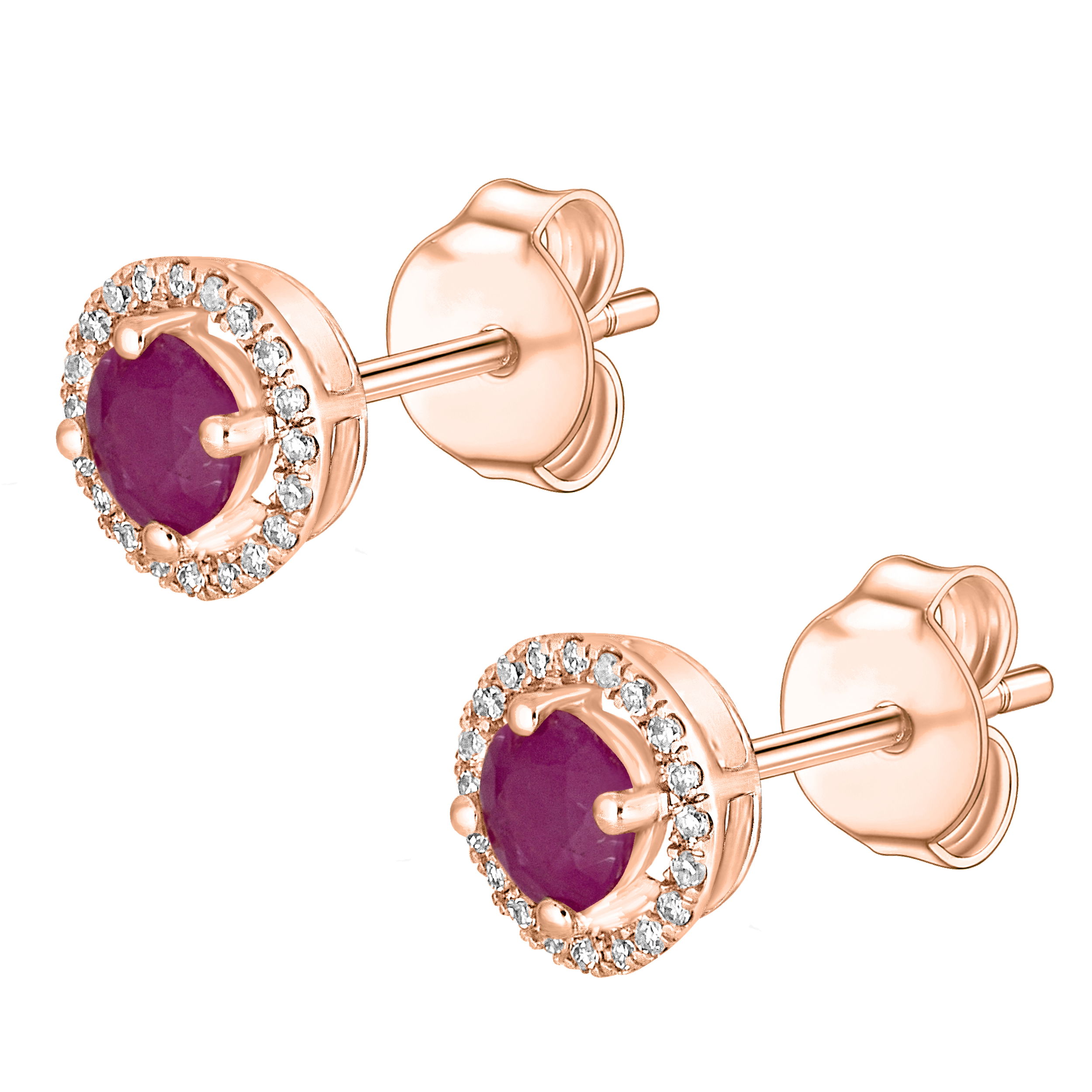 Brilliant red rubies are accented with dazzling diamonds in these luxurious rose gold earrings.• 4mm Round Rubies• 14K Rose Gold Setting• Diamond Accents• Secure Backings• Precious Birthstone Collection