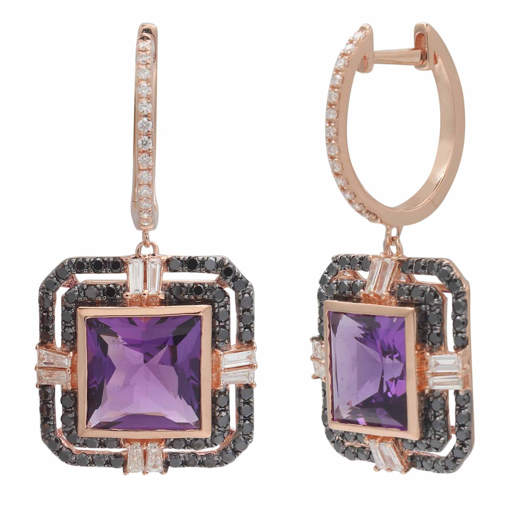 14K ROSE GOLD DIAMOND, TREATED BLACK DIAMOND AND AMETHYST EARRING