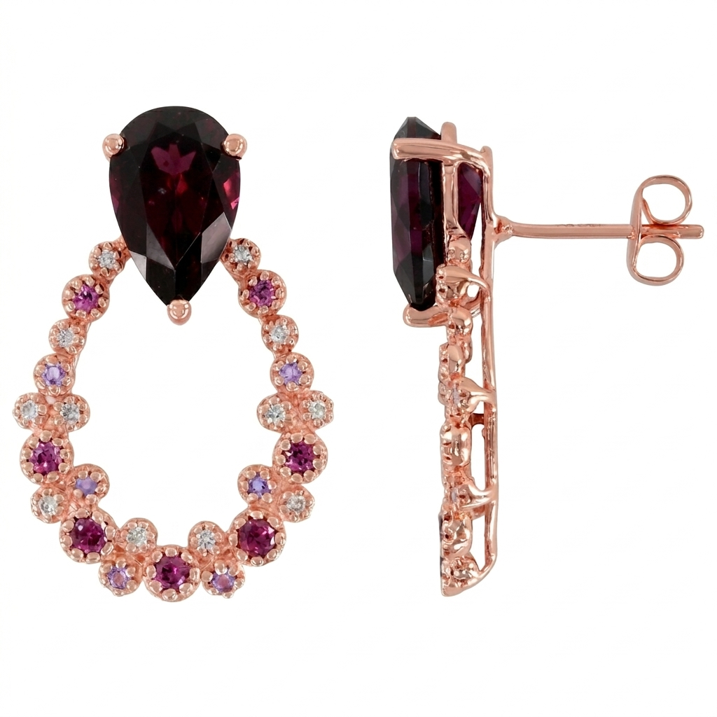 Elevate your elegance with the Lali Jewelry 14K Rose Gold Diamond, Amethyst, and Rhodolite Earrings. Crafted in glowing 14K rose gold, these exquisite earrings showcase pear-shaped 11x7mm amethyst and rhodolite gemstones, delicately accented by sparkling diamonds. The harmonious blend of vivid semi-precious stones and warm rose gold creates a captivating look—perfect for any special occasion or as a luxurious addition to your Amethyst and Rhodolite Collection. Let these luminous earrings frame your face with bold color and timeless sophistication.