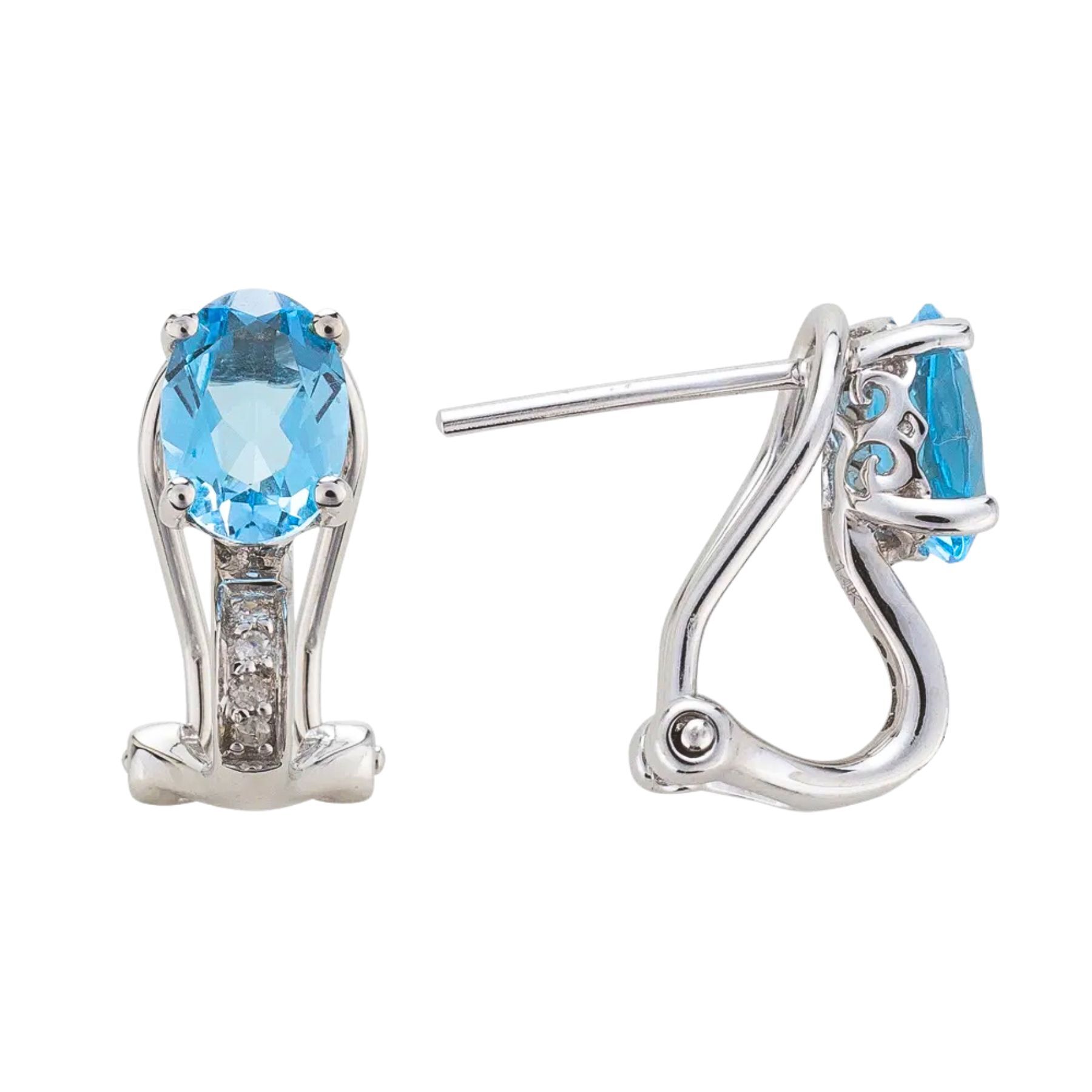 Vibrant Swiss blue topaz stones shimmer alongside brilliant diamonds in these elegant white gold earrings.• 7x5mm Oval Swiss Blue Topaz Gemstones• 14K White Gold Setting• Diamond Accents• Exclusive Collection