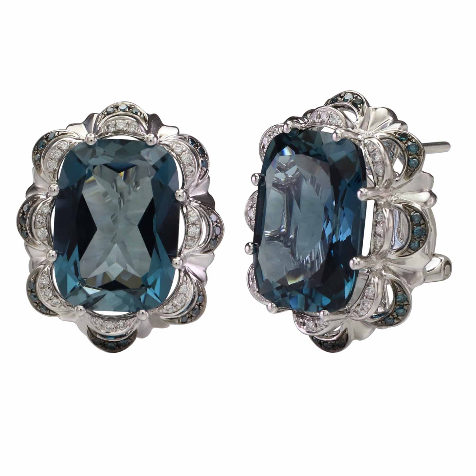 14K WHITE GOLD DIAMOND AND TREATED BLUE DIAMOND AND LONDON BLUE TOPAZ EARRING