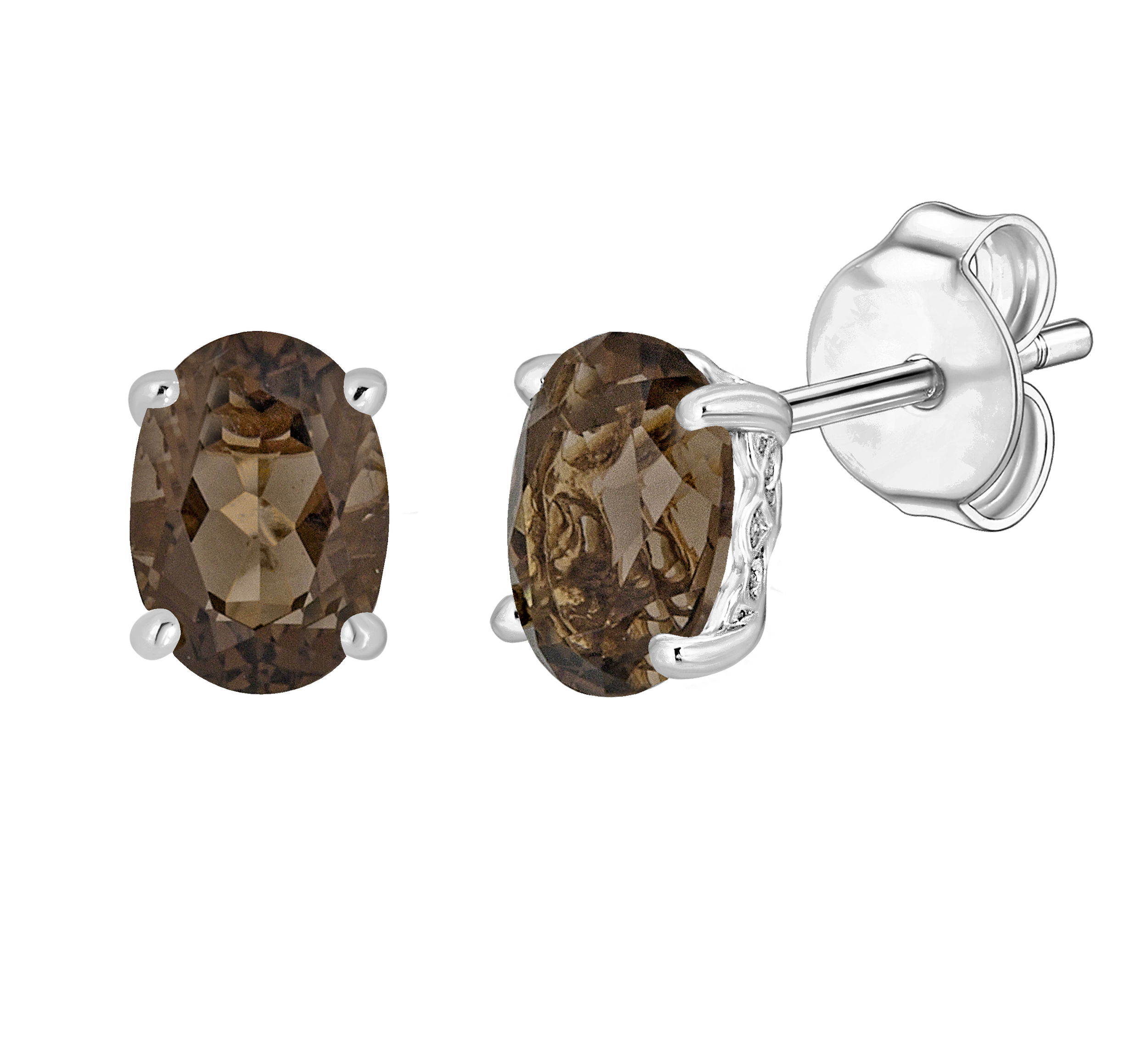 Smoky quartz dazzles in these elegant white gold earrings.• 7x5mm Oval Smoky Quartz Gemstones• 14K White Gold Setting• Secure Backings• Semi Precious Birthstone Collection