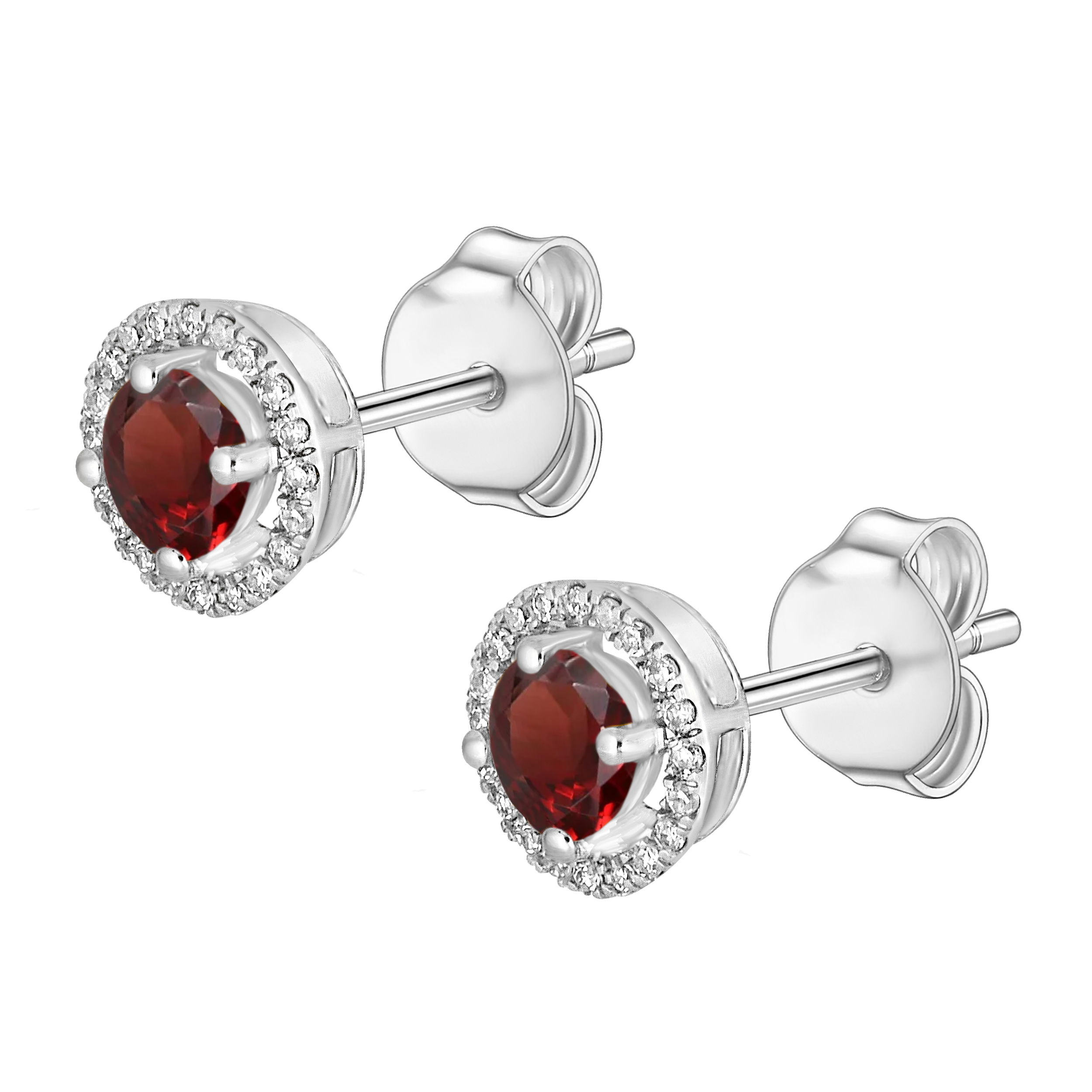 Fiery garnet accented with dazzling diamonds in these luxurious white gold earrings. • 4mm Round Garnet• 14K White Gold Setting• Diamond Accents• Secure Backings• Semi Precious Birthstone Collection