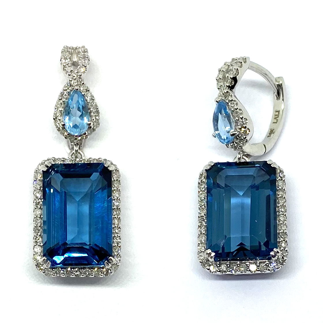 14K WHITE GOLD DIAMOND, SWISS BLUE TOPAZ AND LONDON BLUE TOPAZ EARRING