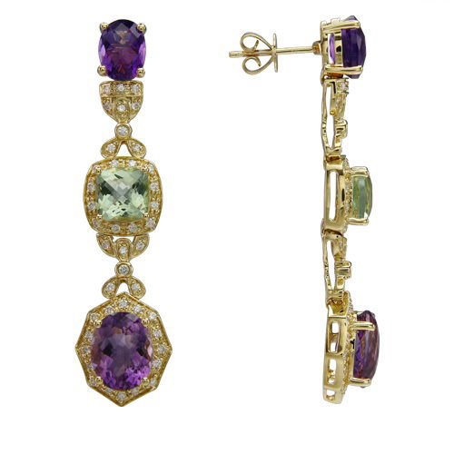 14K YELLOW GOLD DIAMOND, GREEN AMETHYST AND AMETHYST EARRING