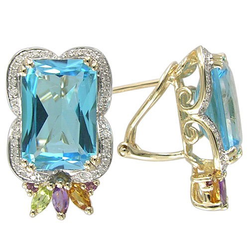 14K YELLOW GOLD DIAMOND, MULTICOLOR GEM STONE AND SWISS BLUE TOPAZ EARRING