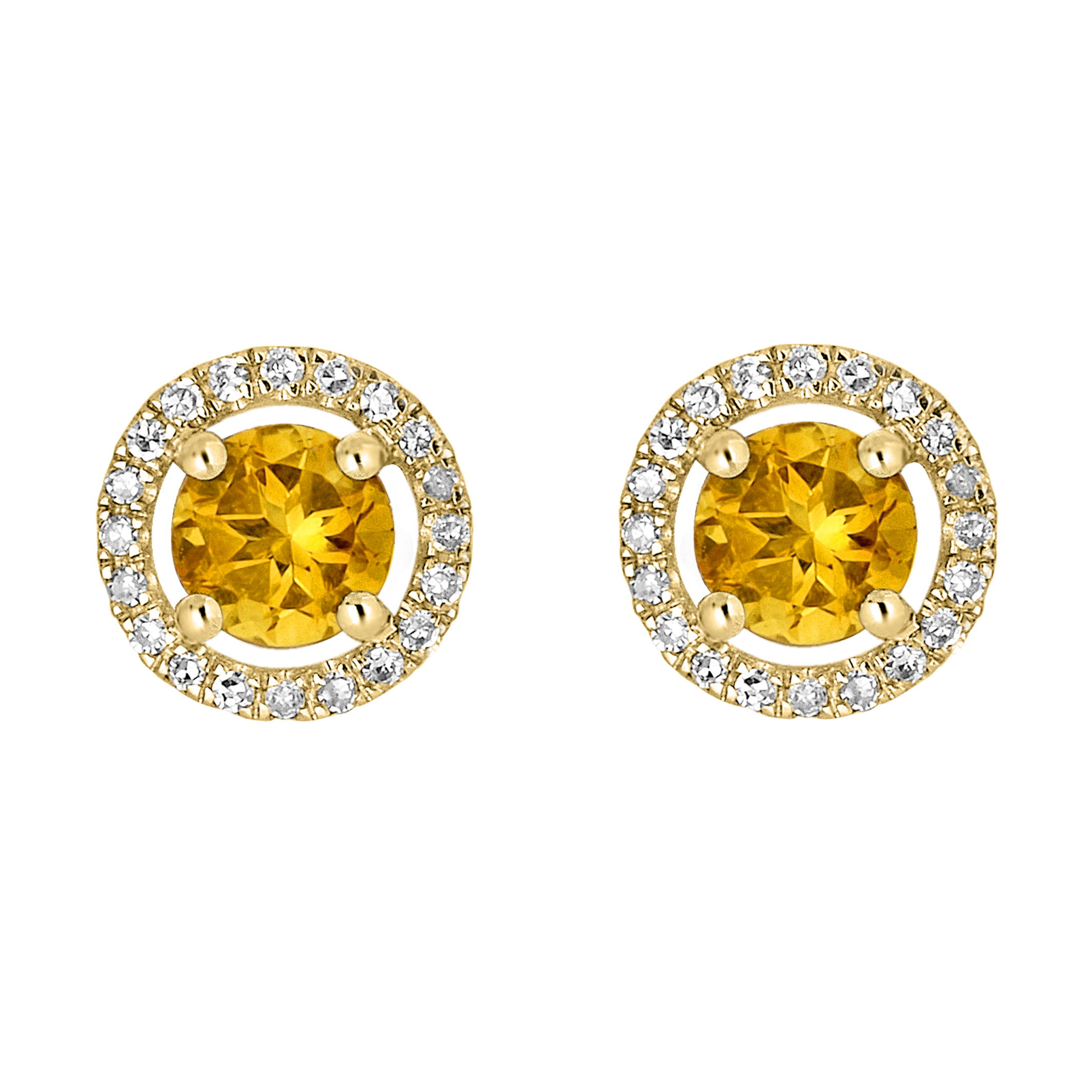 Vivid citrine accented with dazzling diamonds in these luxurious yellow gold earrings.• 4mm Round Citrine• 14K Yellow Gold Setting• Diamond Accents• Secure Backings• Semi Precious Birthstone Collection