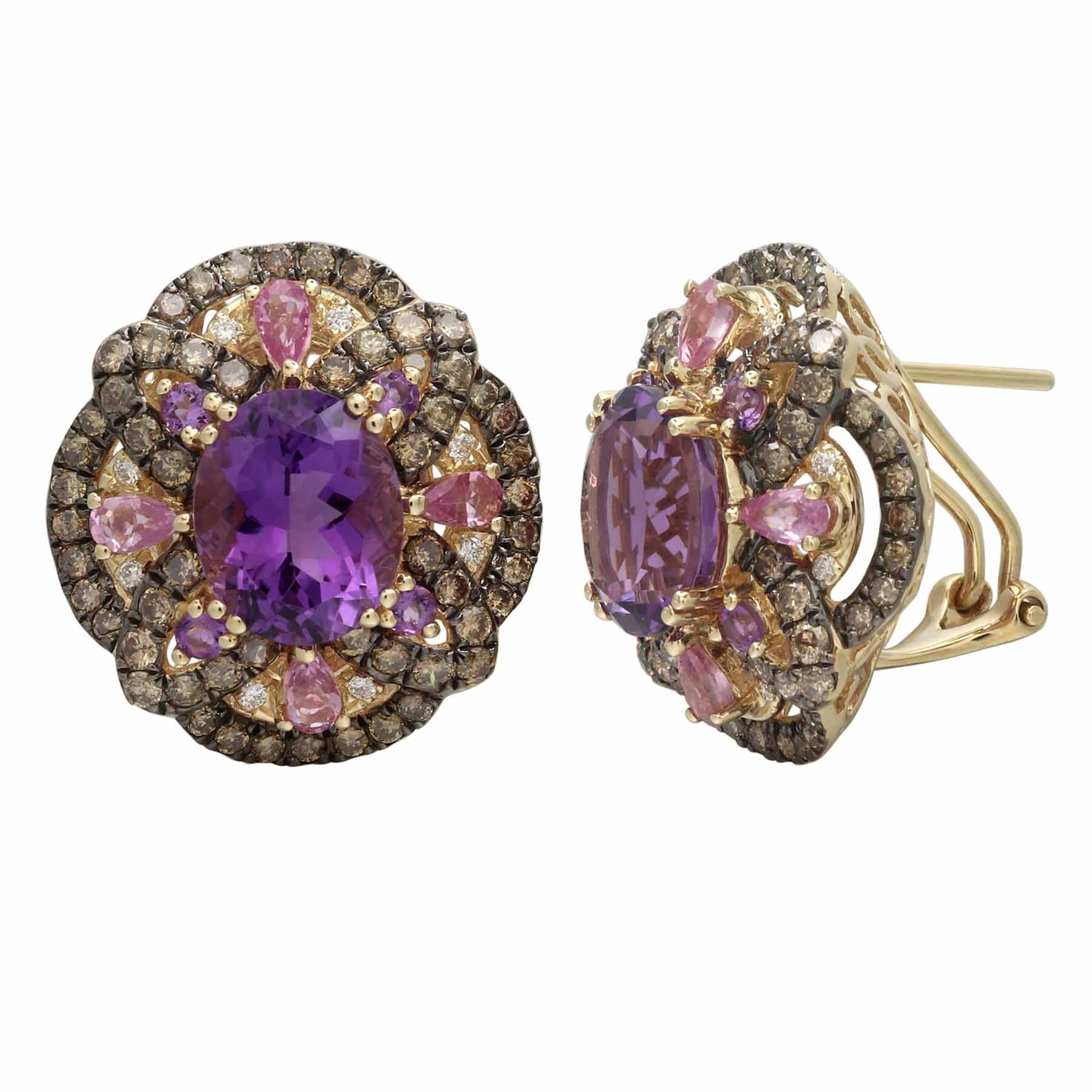 14K YELLOW GOLD DIAMOND, BROWN DIAMOND, PINK SAPPHIRE AND AMETHYST EARRING