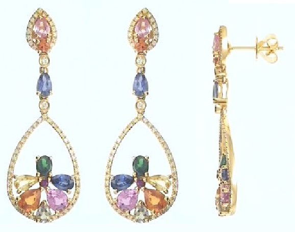 14K YELLOW GOLD DIAMOND, TSAVORITE AND MULTICOLOR SAPPHIRE EARRING