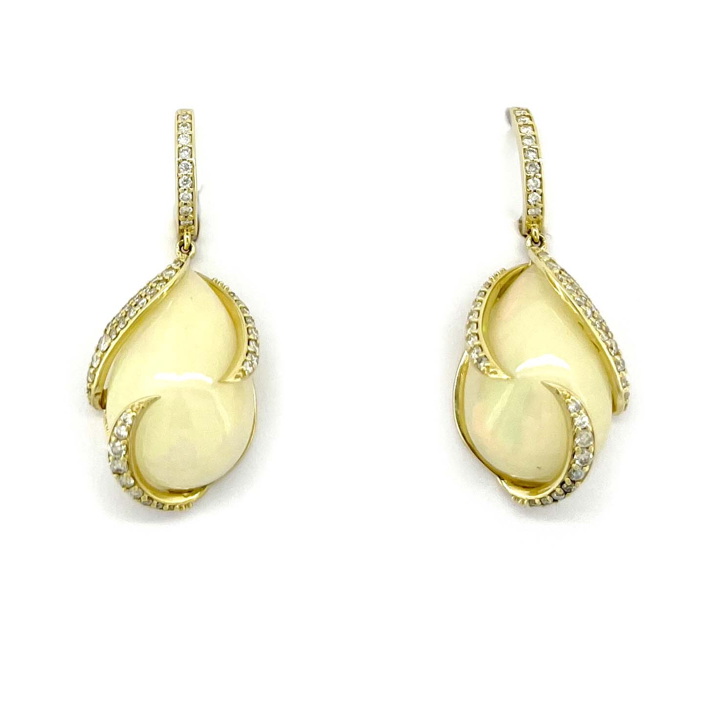 Illuminate your look with these exquisite Limited Edition earrings from our Opal Collection. Each earring features a stunning 18x12mm pear-shaped Ethiopian opal, set in lustrous 14K yellow gold and accented with twinkling diamonds for added brilliance. Hand-selected for their vibrant play of color, these opals are truly one-of-a-kind, making each pair uniquely yours. Elevate any ensemble with the radiant glow and timeless elegance of these exceptional earrings.