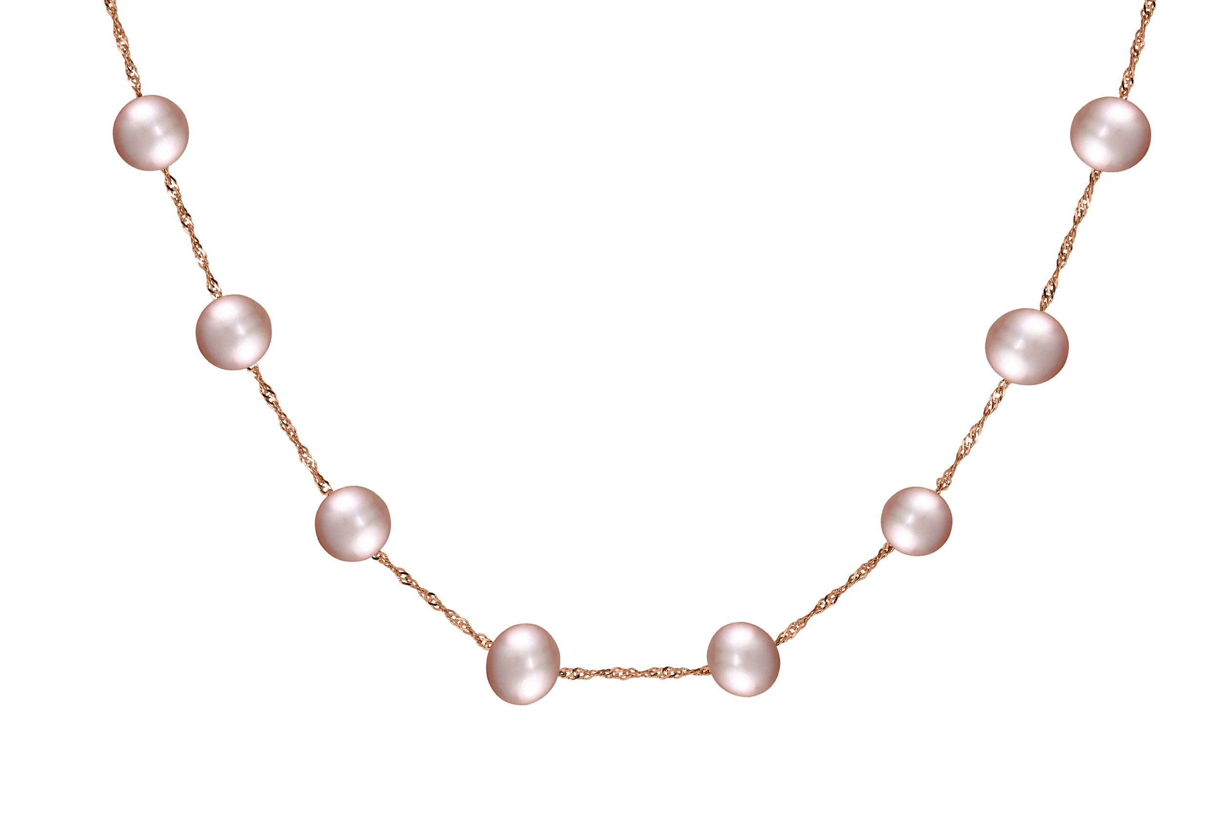 Blushing pink freshwater pearls bring a delicate and timeless charm to this classic rose gold necklace.• 6-6.5 Natural Pink Freshwater Pearls• 14K Rose Gold Setting• 18" Chain With Secure Clasp• Pearl Collection