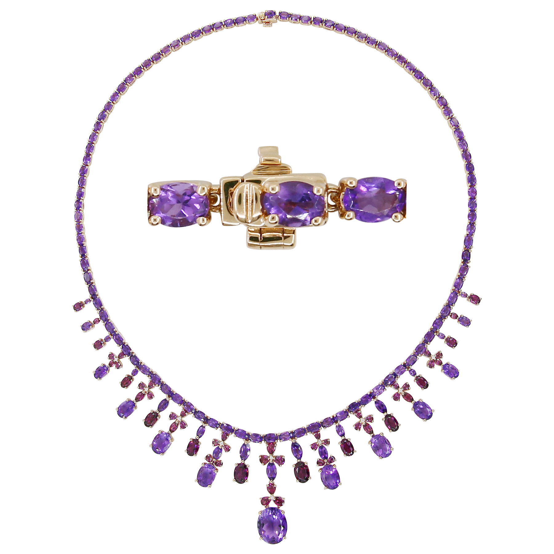 14K ROSE GOLD DIAMOND, RHODOLITE AND AMETHYST NECKLACE
