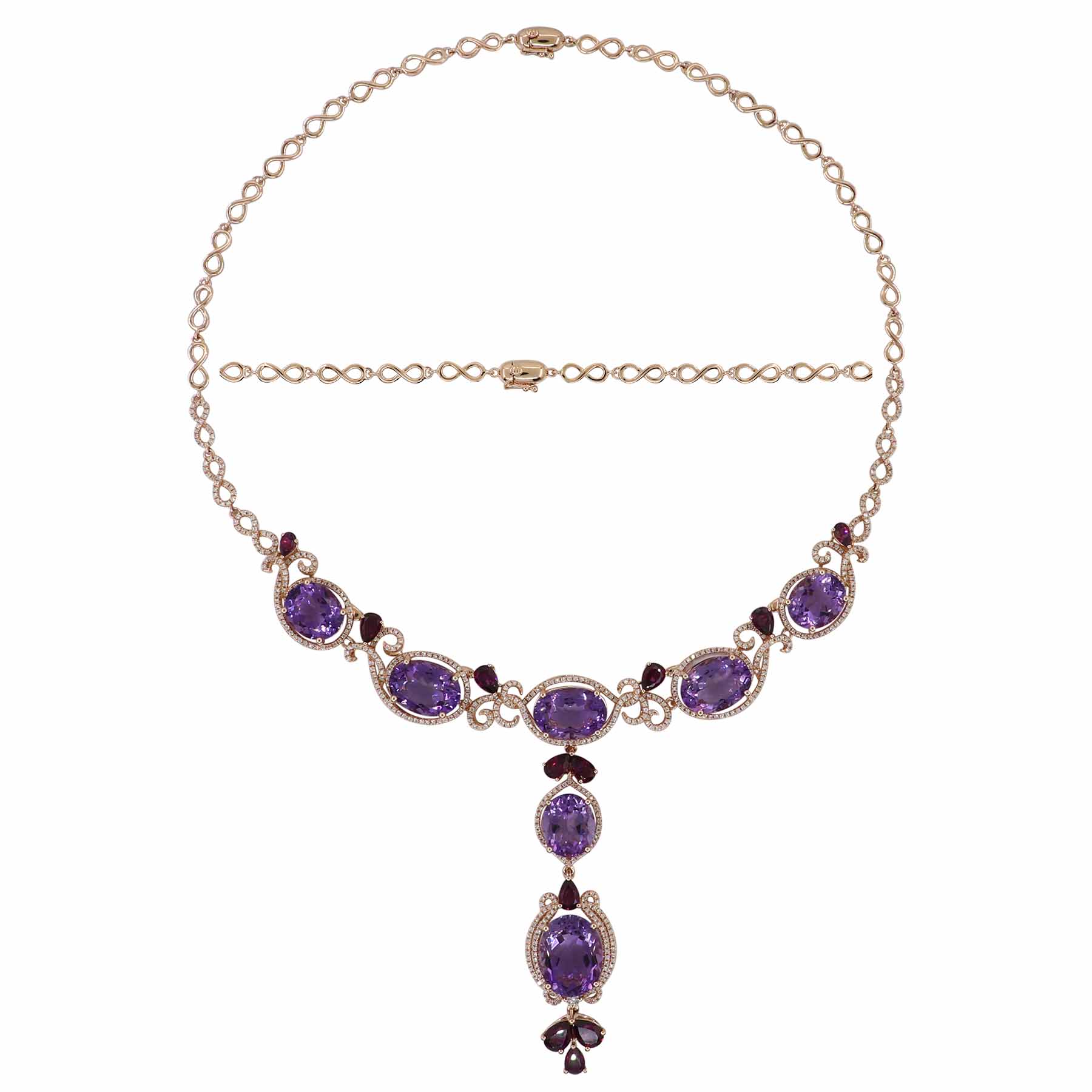 14K ROSE GOLD DIAMOND, RHODOLITE AND AMETHYST NECKLACE