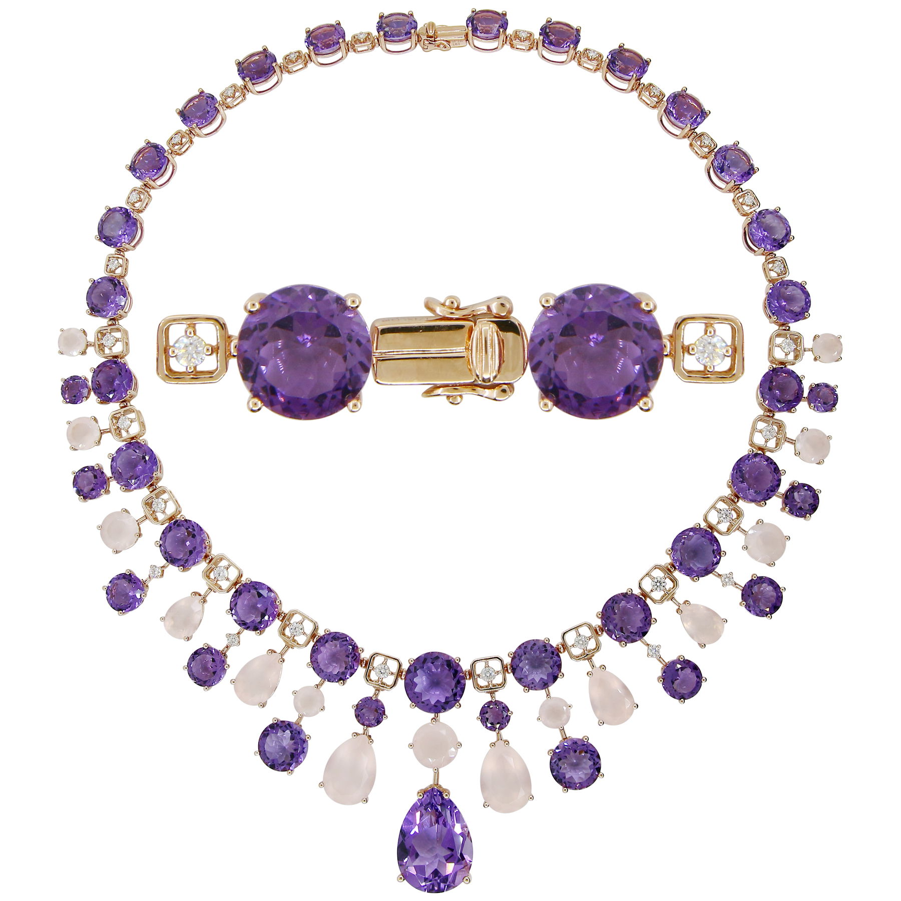 14K ROSE GOLD DIAMOND, ROSE QUARTZ AND AMETHYST NECKLACE