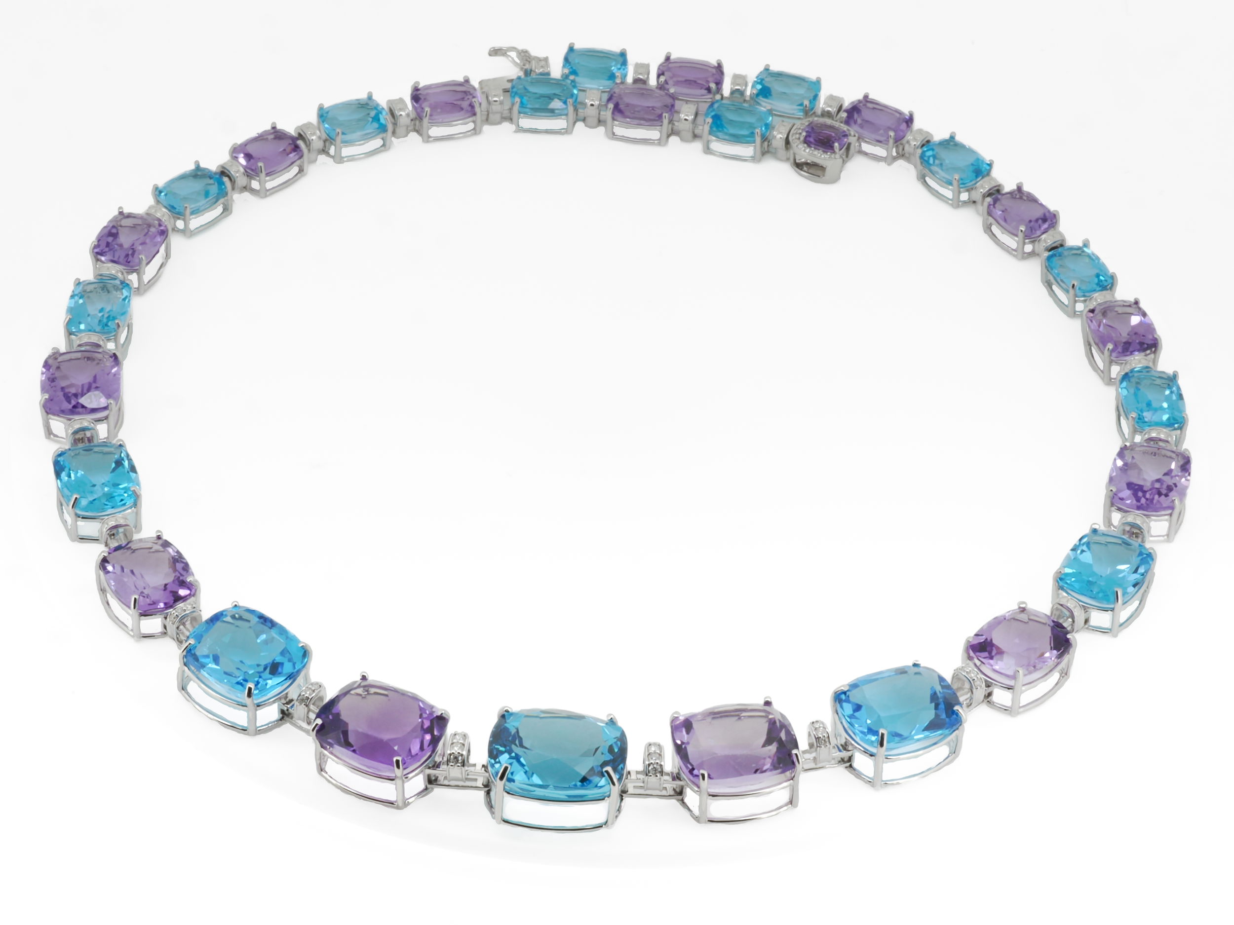 14K WHITE GOLD DIAMOND, AMETHYST AND SWISS BLUE TOPAZ NECKLACE