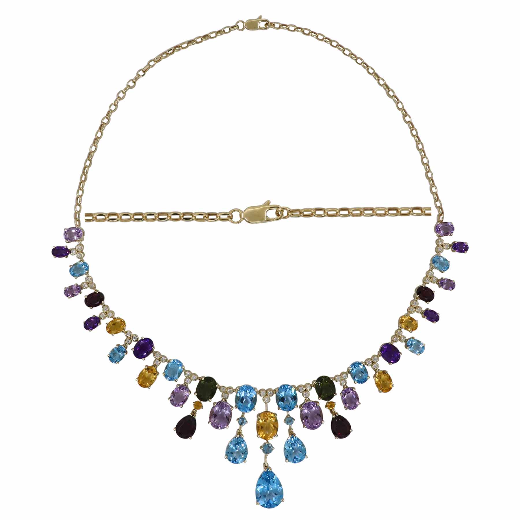 14K YELLOW GOLD DIAMOND, MULTICOLOR GEMSTONES AND SWISS BLUE TOPAZ NECKLACE