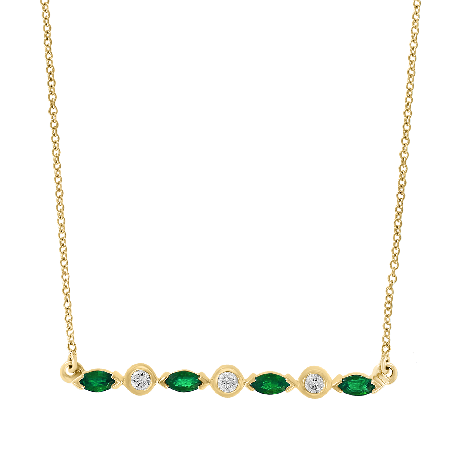 Radiant emeralds paired with sparkling diamonds create a luxurious statement in this elegant yellow gold necklace.• 4x2mm Marquise Emerald Gemstone• Diamond Accents• 14K Yellow Gold Setting• 18" Chain With Secure Clasp• Precious Collection