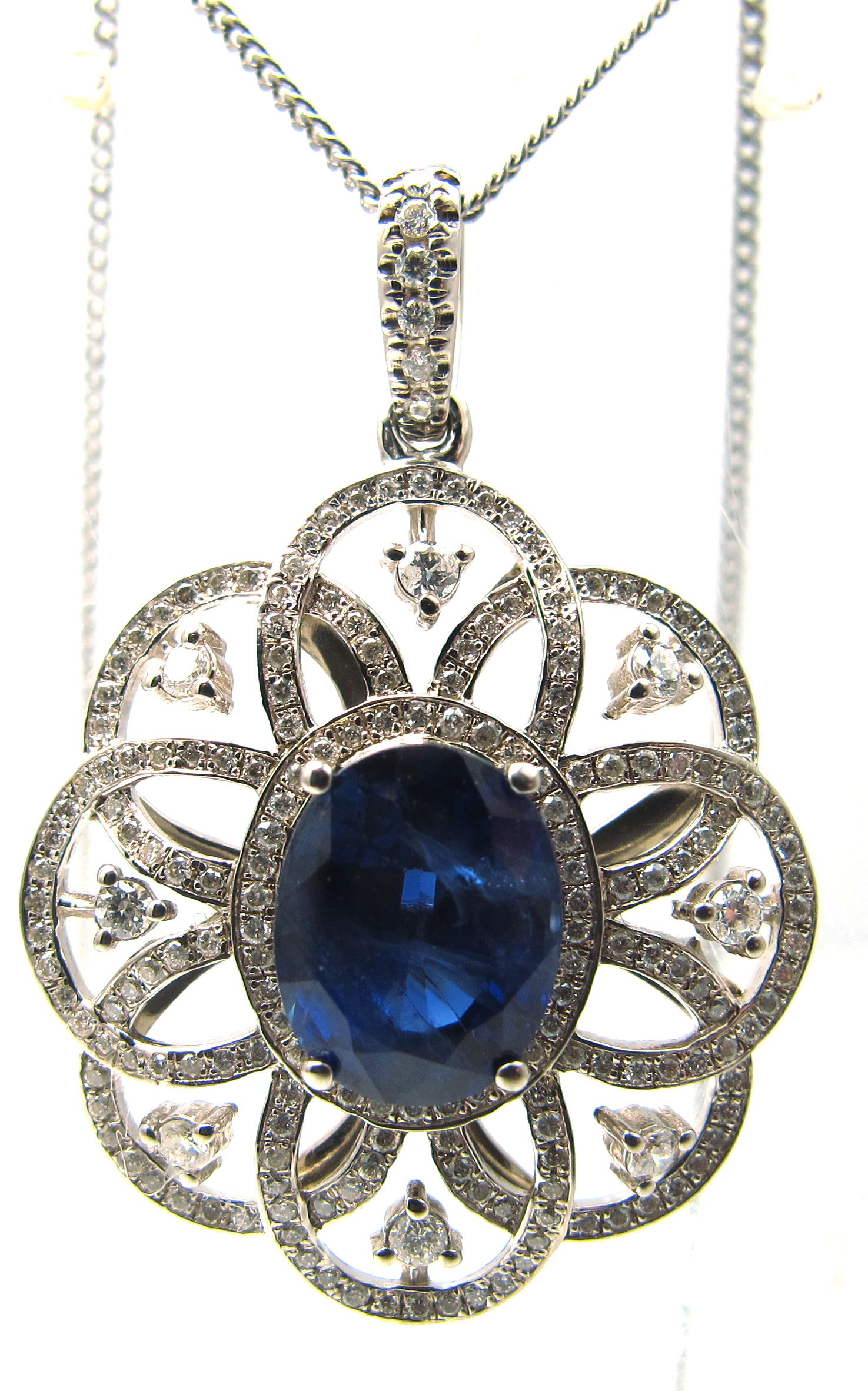 18K WHITE GOLD DIAMOND AND SAPPHIRE PENDANT WITH CHAIN