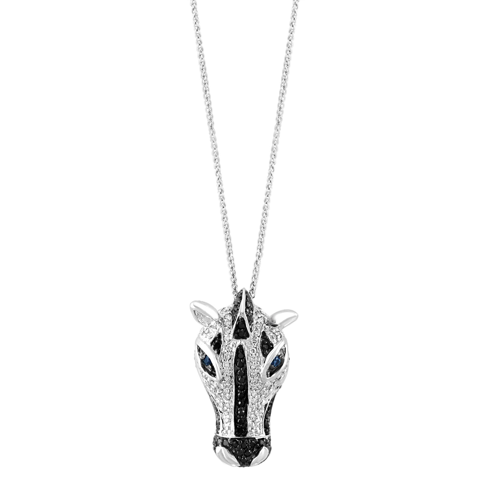 18K WHITE GOLD DIAMOND, TREATED BLACK DIAMOND AND SAPPHIRE HORSE PENDANT WITH CHAIN