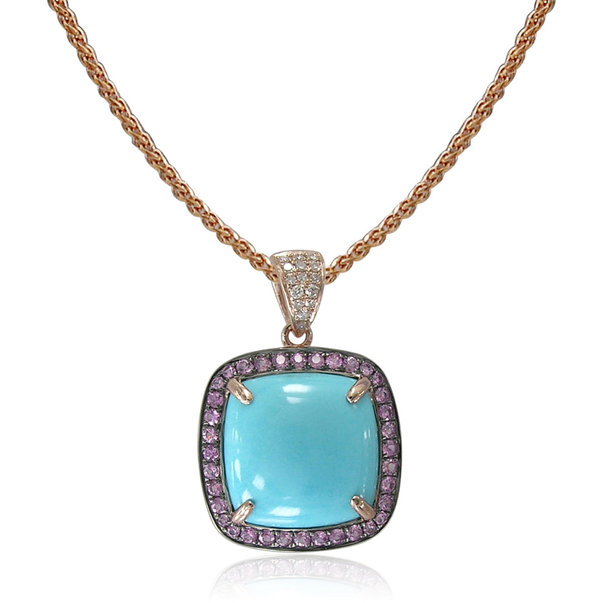 14K ROSE GOLD DIAMOND, PINK SAPPHIRE AND TURQUOISE PENDANT WITH CHAIN