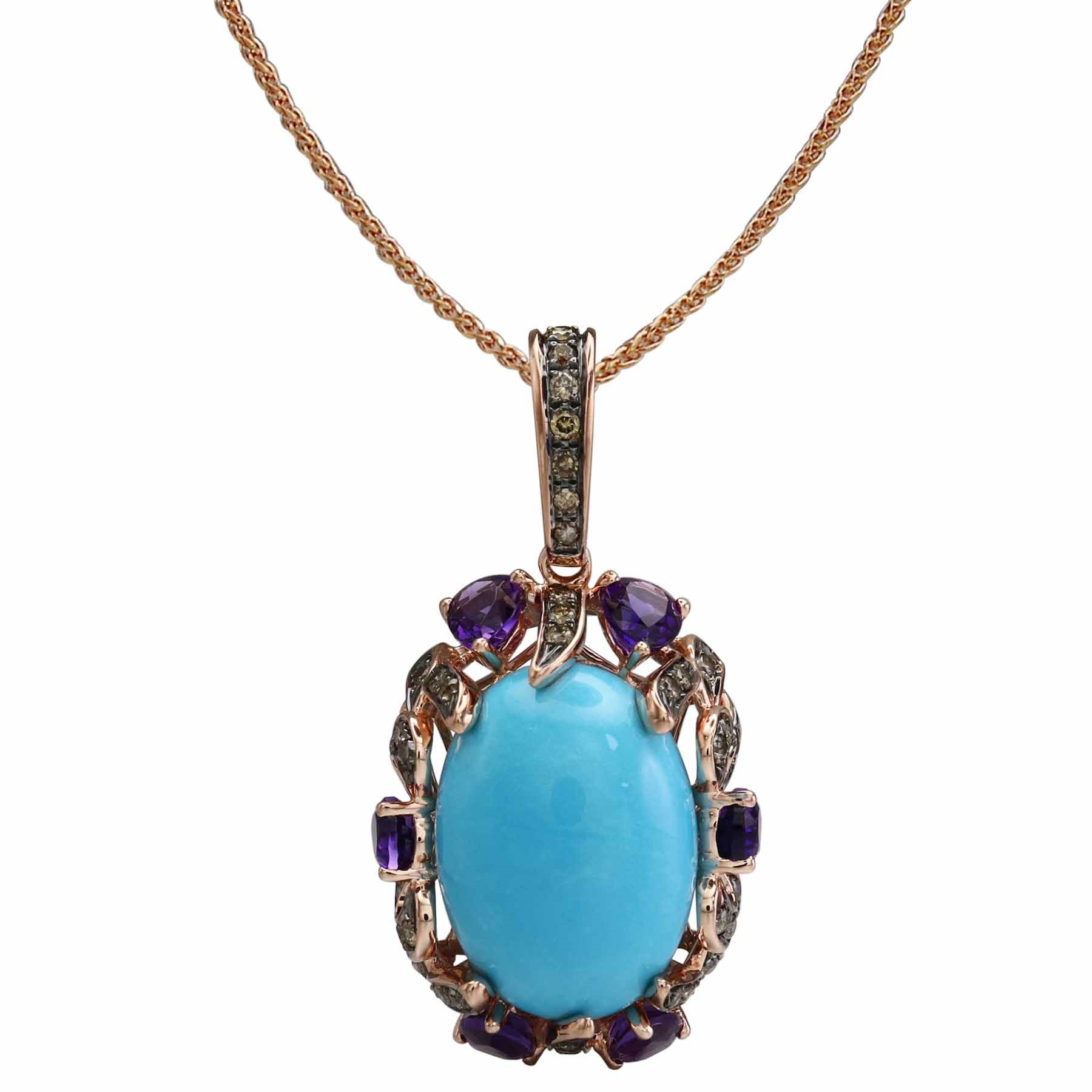 14K ROSE GOLD BROWN DIAMOND, AMETHYST AND TURQUOISE PENDANT WITH CHAIN