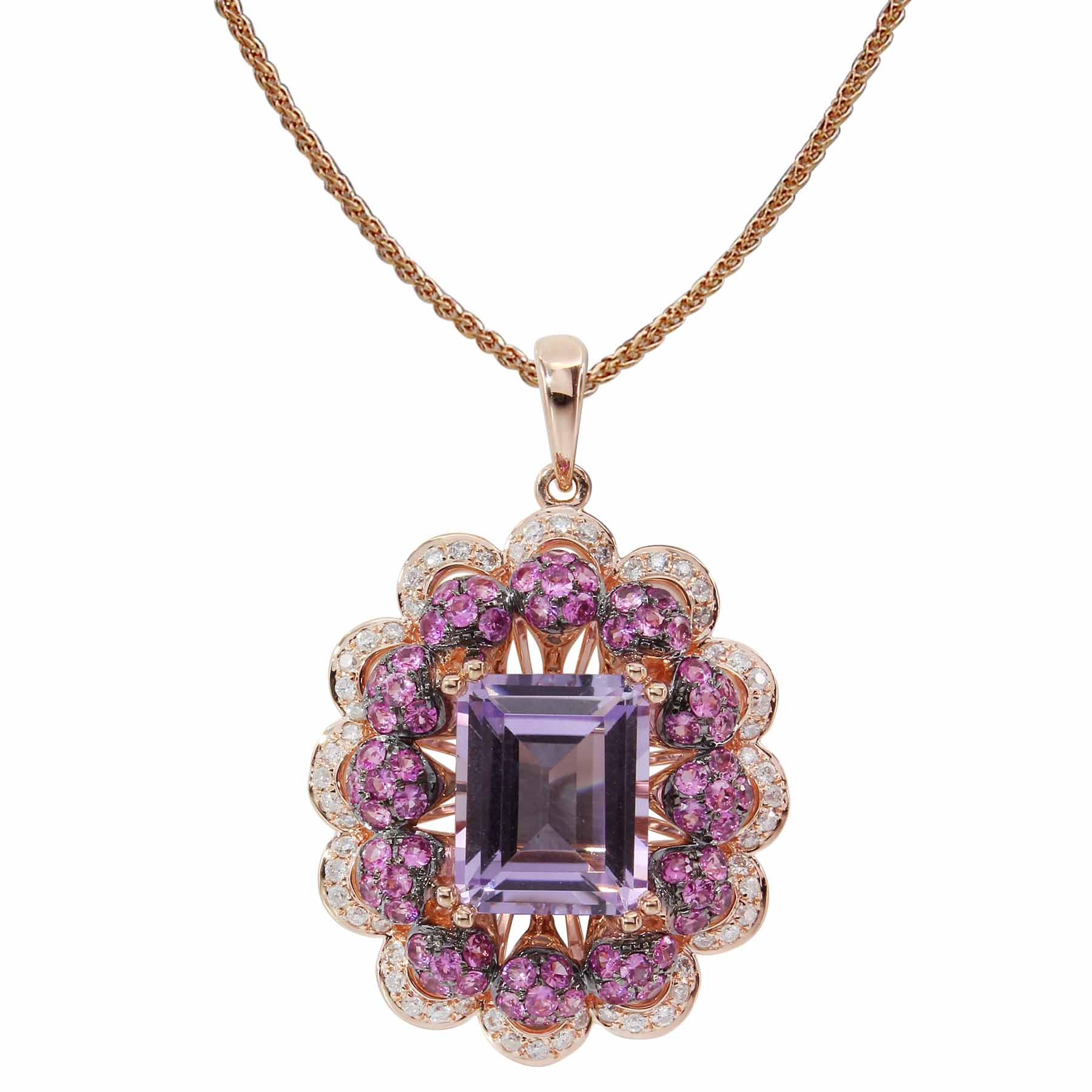 14K ROSE GOLD DIAMOND, PINK SAPPHIRE AND PINK AMETHYST PENDANT