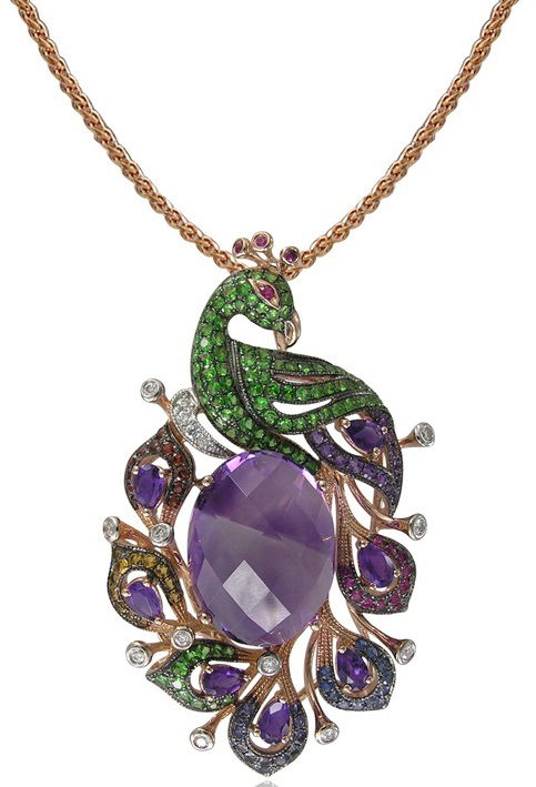 14K ROSE GOLD DIAMOND, MULTICOLOR, AND AMETHYST PEACOCK PENDANT WITH CHAIN