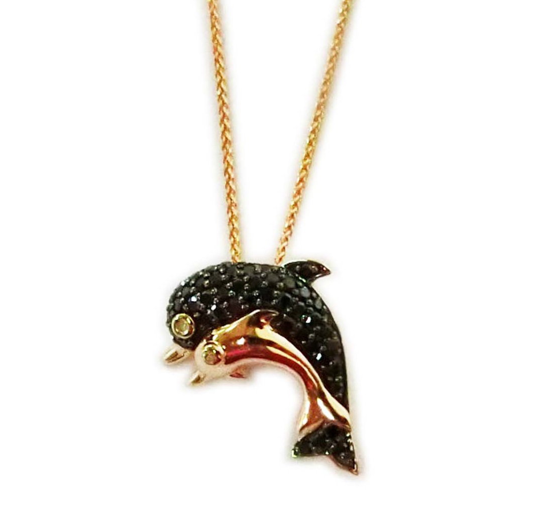 14K ROSE GOLD DIAMOND AND TREATED BLACK DIAMOND DOLPHIN PENDANT WITH CHAIN