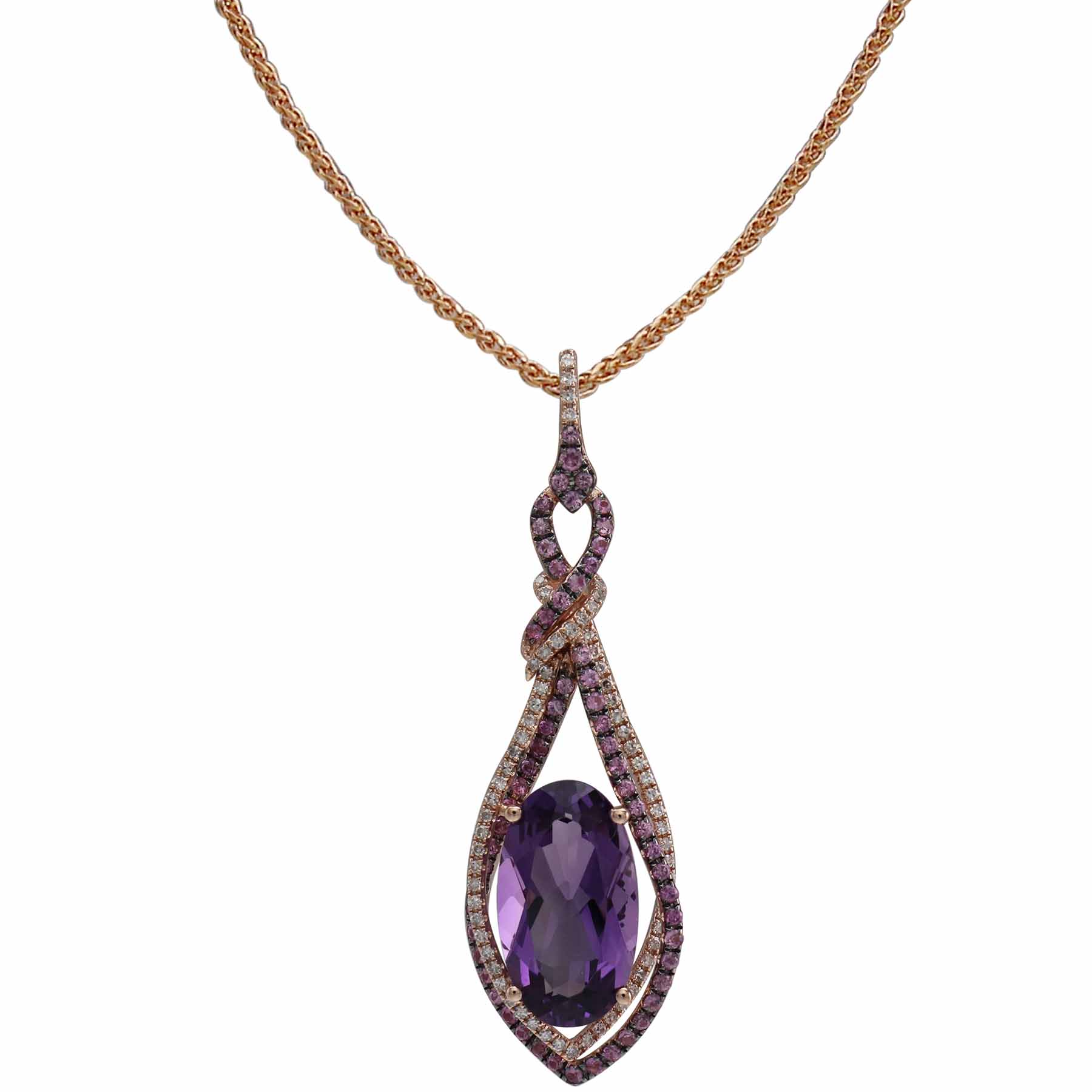 14K ROSE GOLD DIAMOND, PINK SAPPHIRE AND AMETHYST PENDANT WITH CHAIN