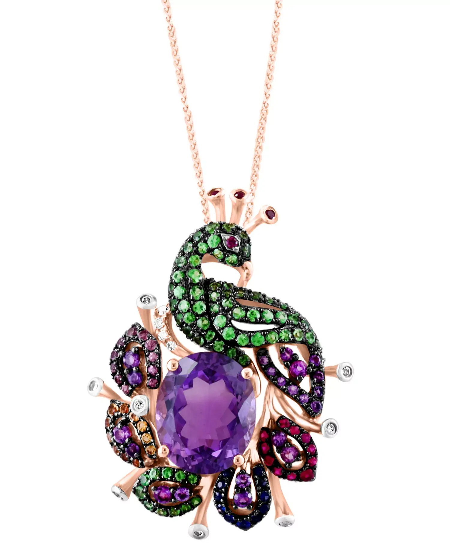 14K ROSE GOLD DIAMOND, MULTICOLOR AND AMETHYST PEACOCK PENDANT WITH CHAIN