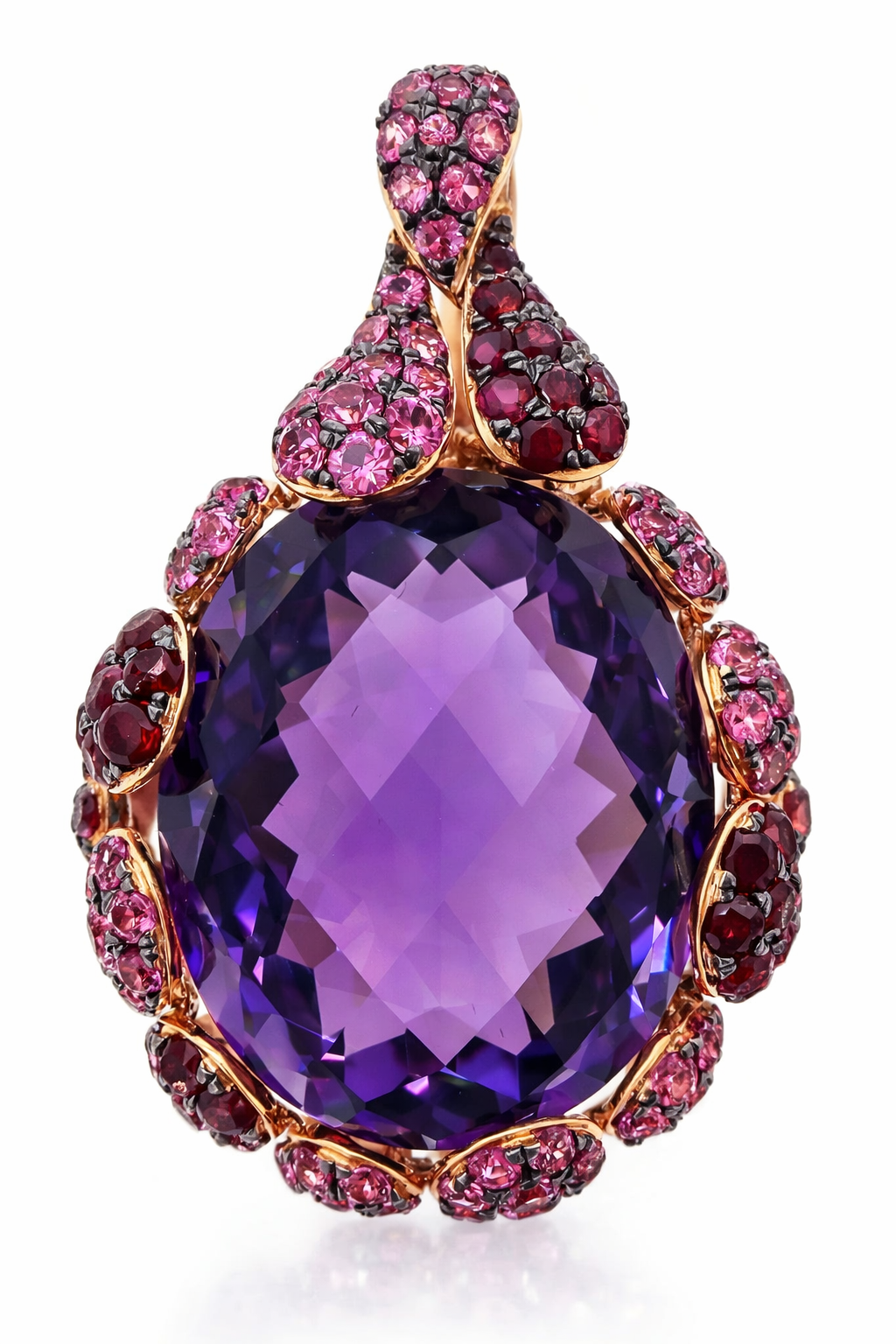 Celebrate sophistication and vibrant color with our Limited Edition 14K Rose Gold Pendant, featuring a captivating trio of gemstones—pink sapphire, ruby (GSI# 31677320101), and amethyst. This exquisite piece from our Amethyst and Semi Precious Birthstone Collection showcases a lustrous 17x14mm oval amethyst, enhanced by the delicate blush of pink sapphire and the passionate allure of ruby. All set in radiant 14K rose gold, the pendant hangs on a matching chain, making it an extraordinary addition to your jewelry wardrobe or a thoughtful gift for someone special. Embrace elegance, rarity, and the enchanting hues of this remarkable limited edition pendant.