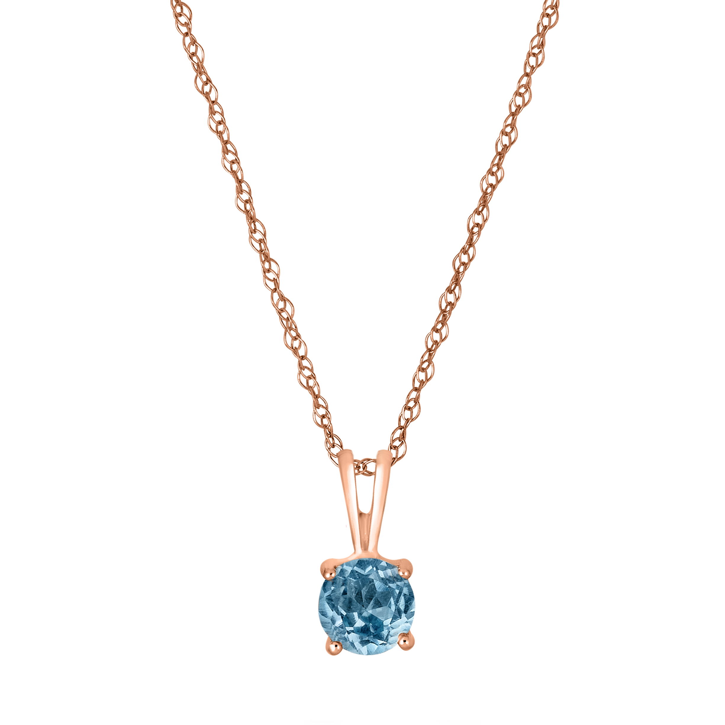 This dazzling rose gold necklace features a vibrant Swiss blue topaz gemstone.• 5mm Round Swiss Blue Topaz Gemstone• 14K Rose Gold Setting• 18" Rope Chain With Spring Lock• Semi Precious Birthstone Collection