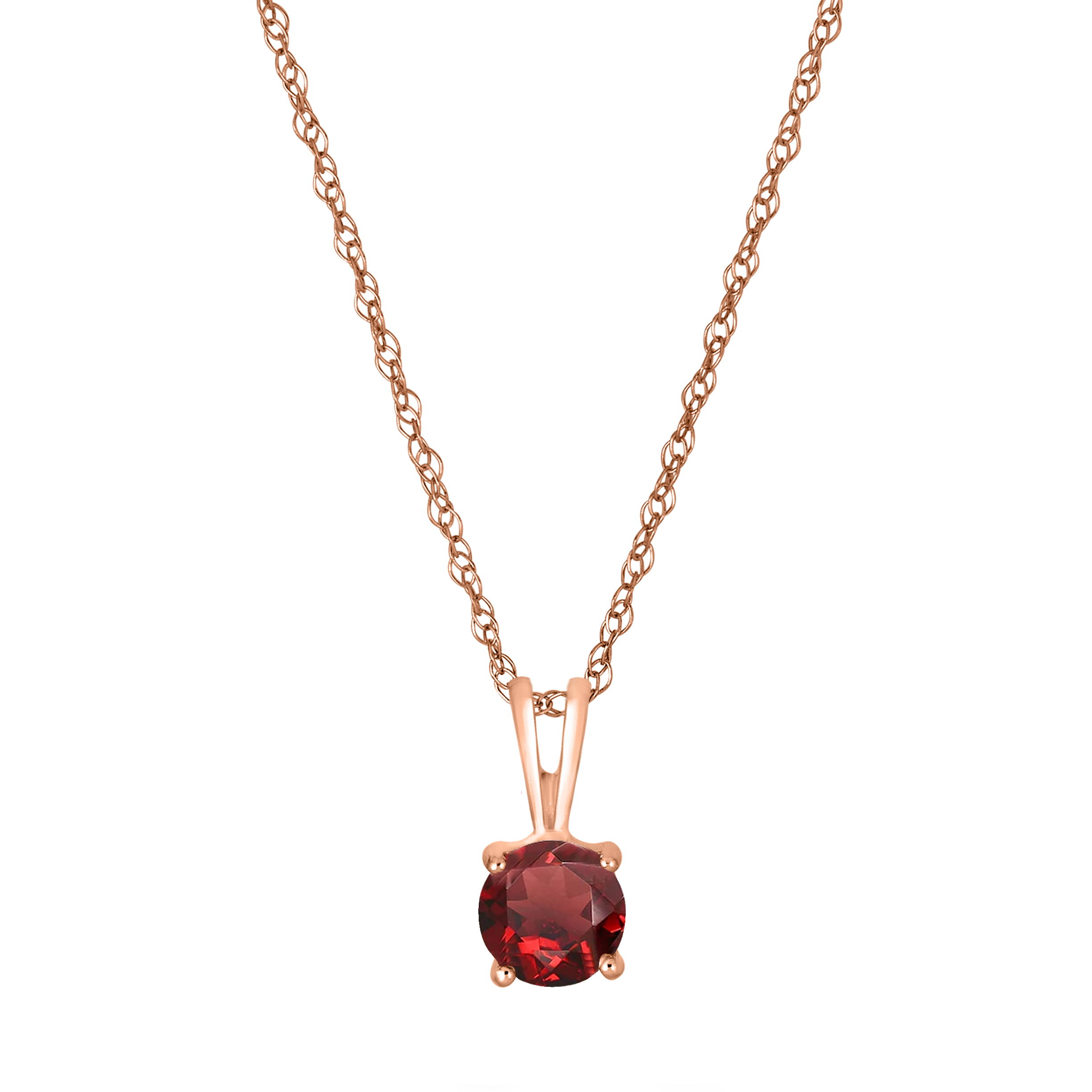 This dazzling rose gold necklace features a fiery garnet gemstone.• 5mm Round Garnet Gemstone• 14K Rose Gold Setting• 18" Rope Chain With Spring Lock• Semi Precious Birthstone Collection