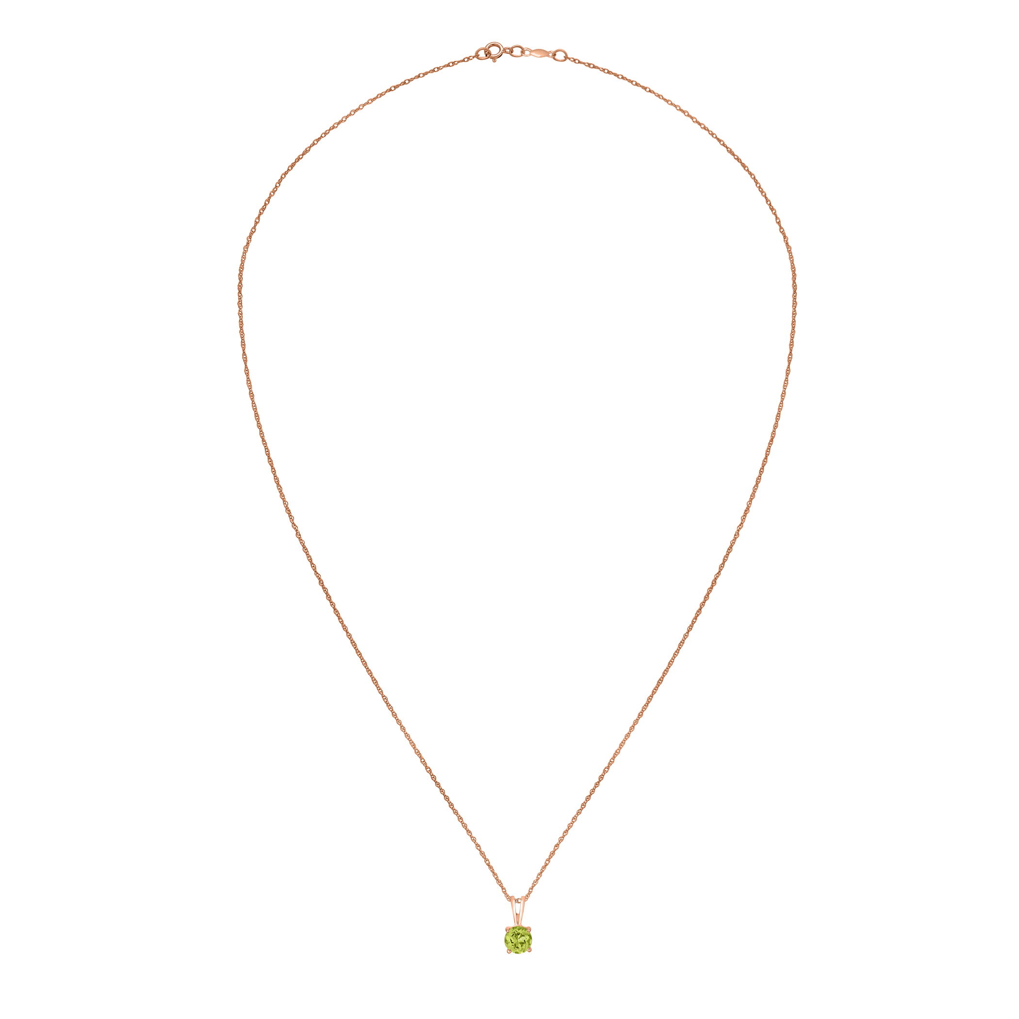 This dazzling rose gold necklace features a luminous peridot gemstone.• 5mm Round Peridot Gemstone• 14K Rose Gold Setting• 18" Rope Chain With Spring Lock• Semi Precious Birthstone Collection