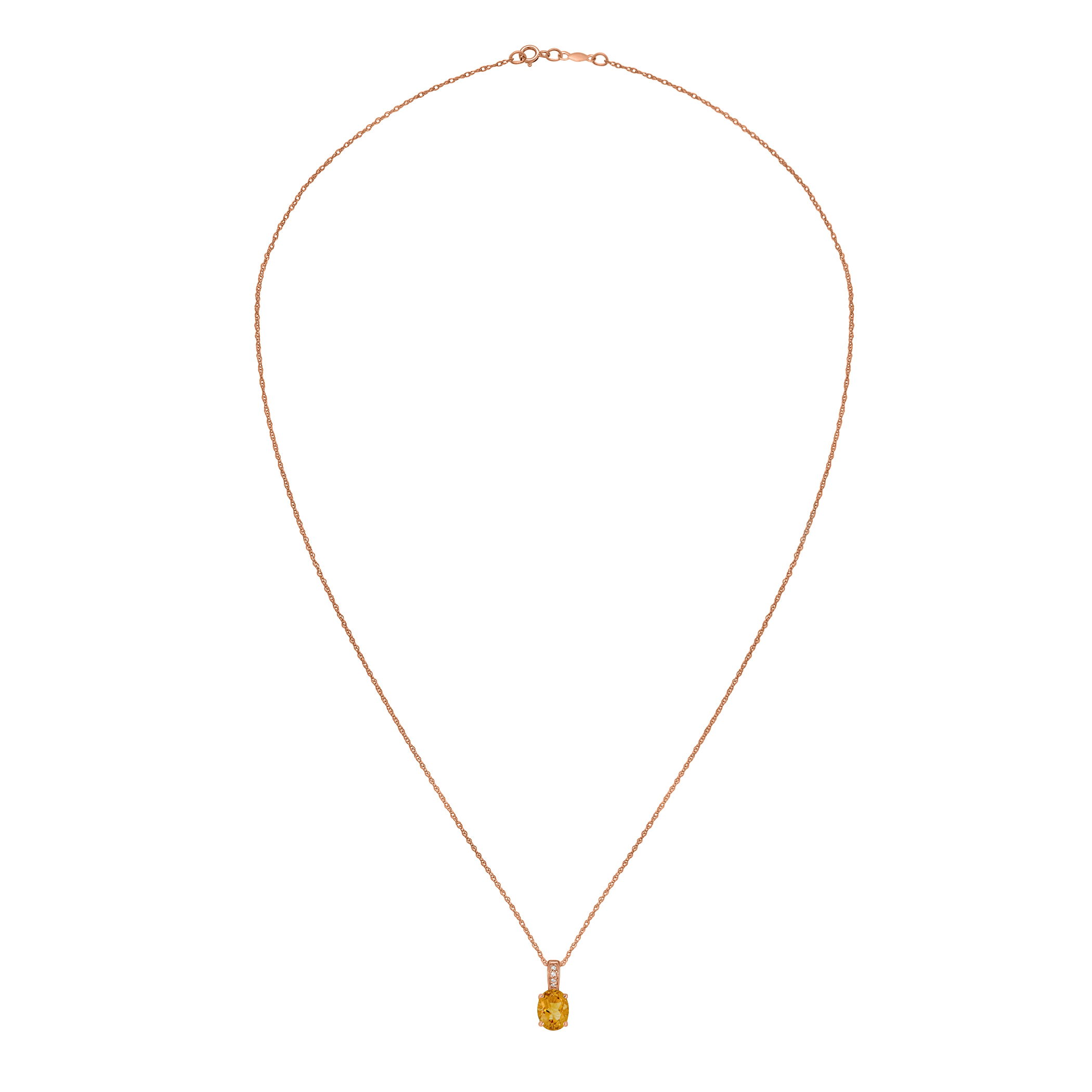 Luminous citrine is set alongside glittering diamonds in this refined rose gold necklace.• 8x6mm Oval Citrine Gemstone• 14K Rose Gold Setting• Diamond Accents• 18" Rope Chain With Spring Lock• Semi Precious Birthstone Collection