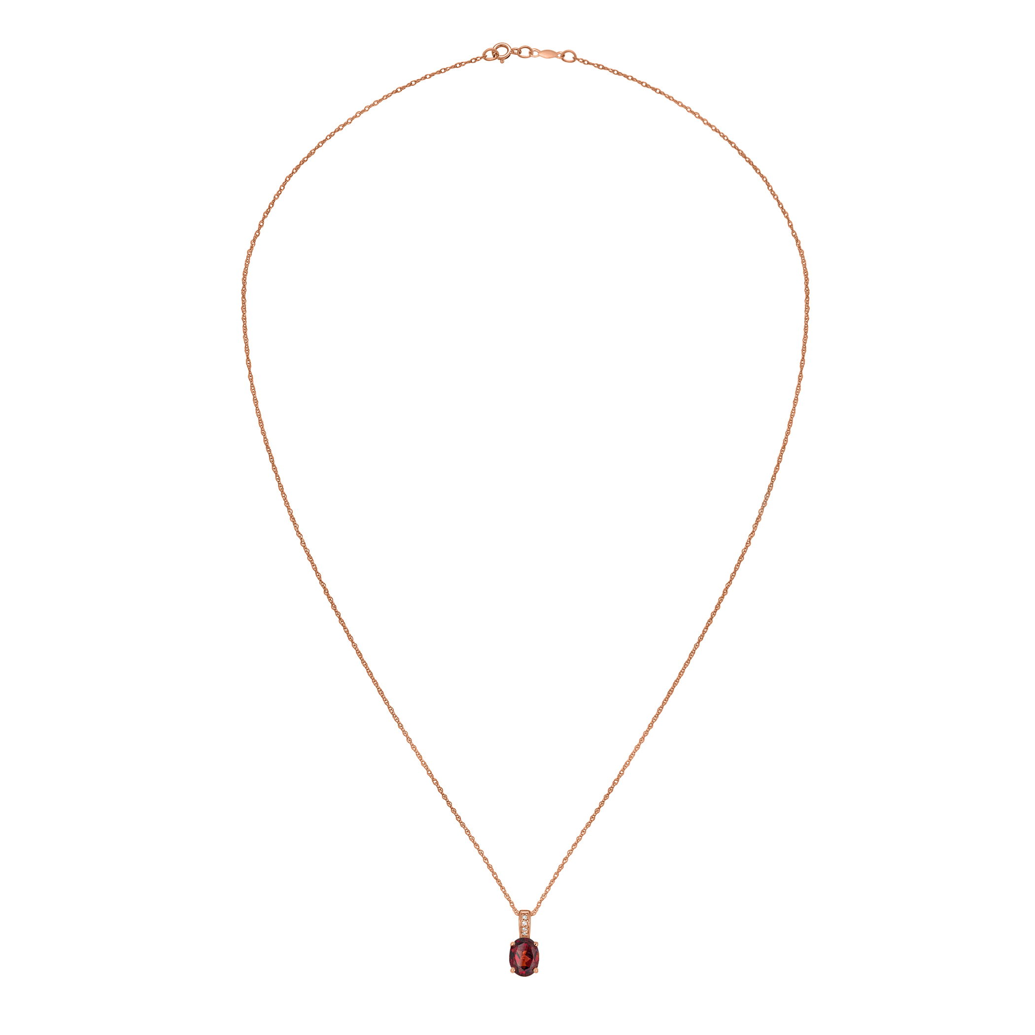 Fiery garnet is set alongside glittering diamonds in this refined rose gold necklace.• 8x6mm Oval Garnet Gemstone• 14K Rose Gold Setting• Diamond Accents• 18" Rope Chain With Spring Lock• Semi Precious Birthstone Collection