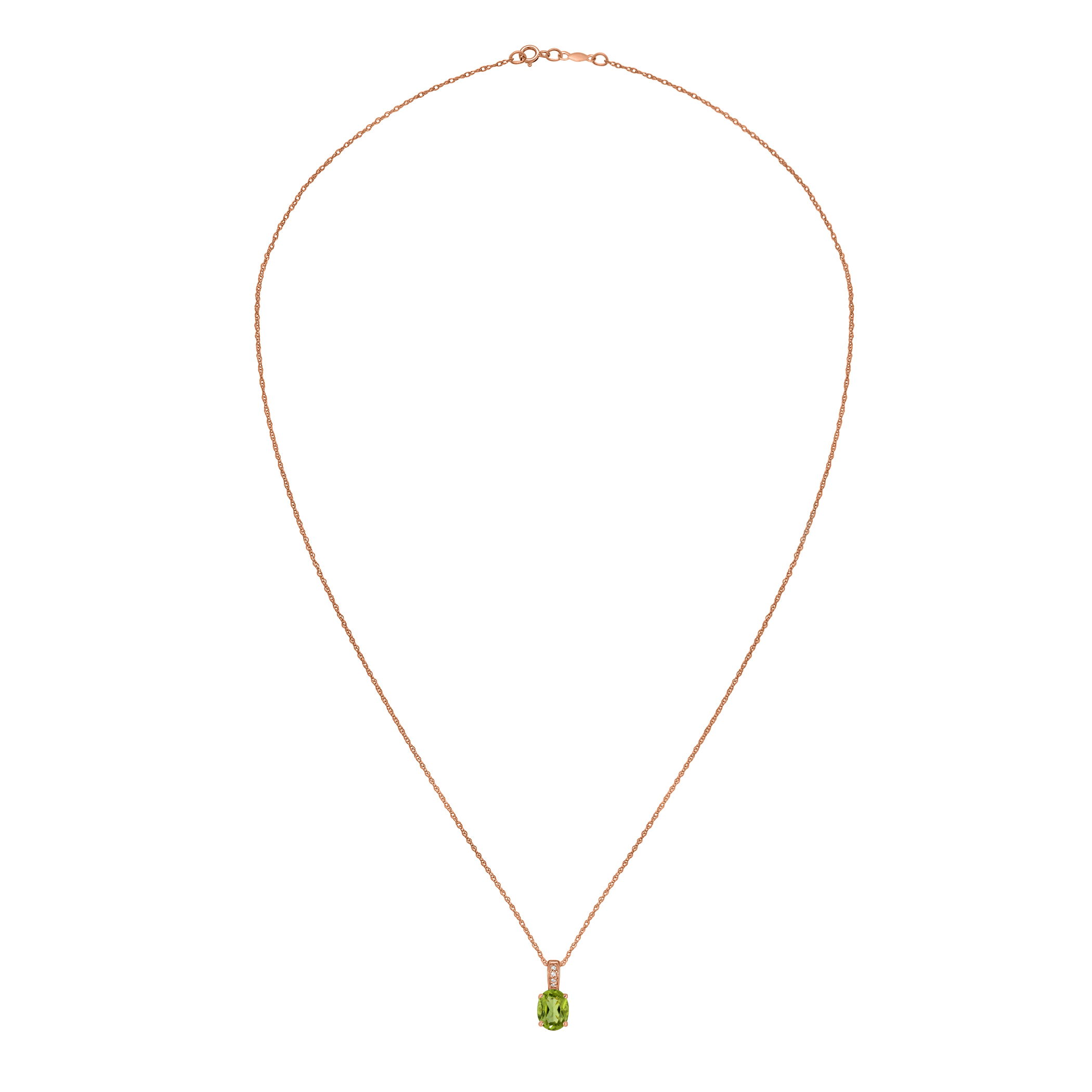 Bright peridot is set alongside glittering diamonds in this refined rose gold necklace.• 8x6mm Oval Peridot Gemstone• 14K Rose Gold Setting• Diamond Accents• 18" Rope Chain With Spring Lock• Semi Precious Birthstone Collection