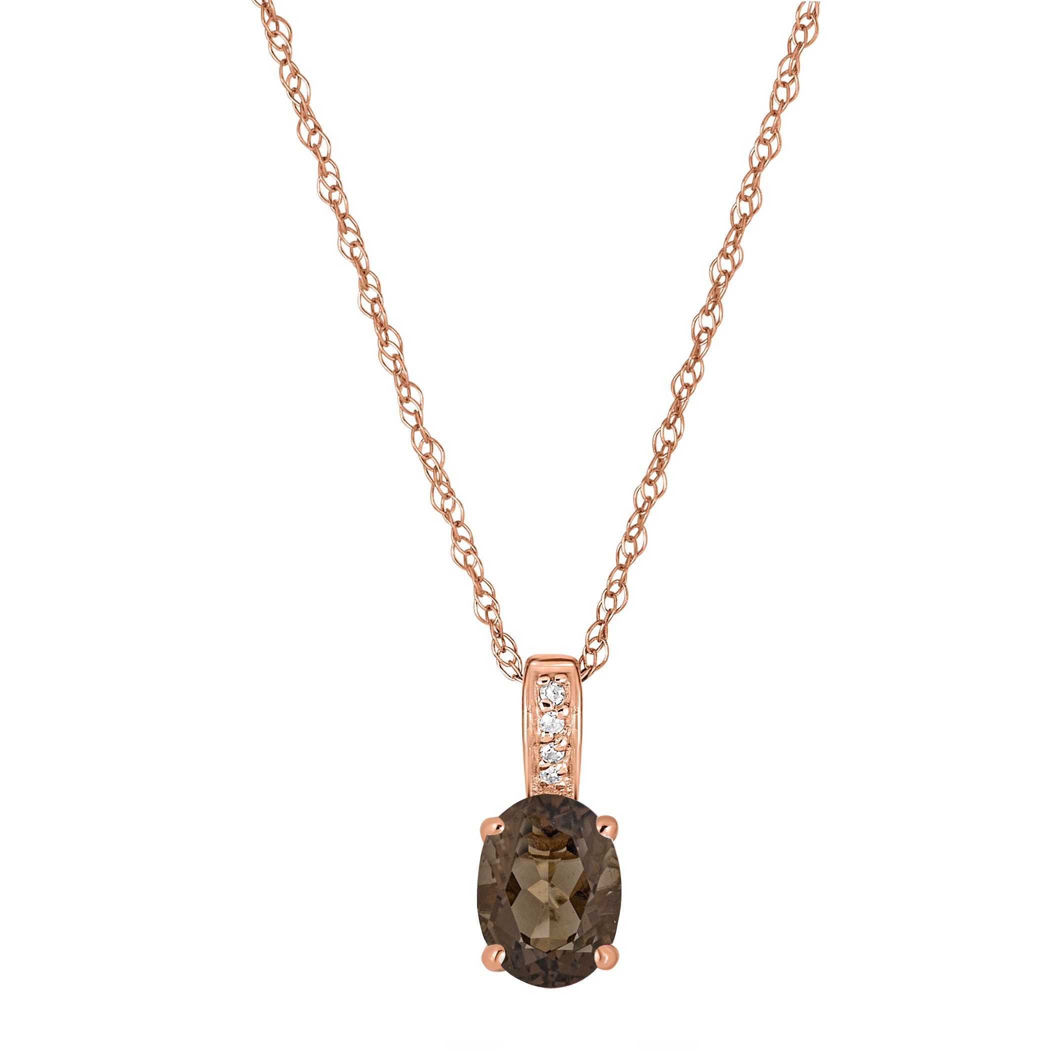 Rich smoky quartz is set alongside glittering diamonds in this refined rose gold necklace.• 8x6mm Oval Smoky Quartz Gemstone• 14K Rose Gold Setting• Diamond Accents• 18" Rope Chain With Spring Lock• Semi Precious Birthstone Collection