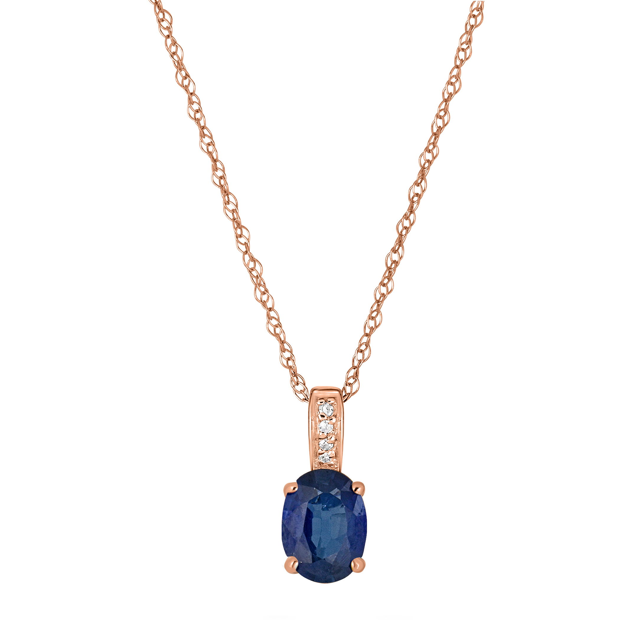 Deep blue sapphire is set alongside glittering diamonds in this refined rose gold necklace.• 7x5mm Oval Sapphire Gemstone• 14K Rose Gold Setting• Diamond Accents• 18" Rope Chain With Spring Lock• Precious Birthstone Collection