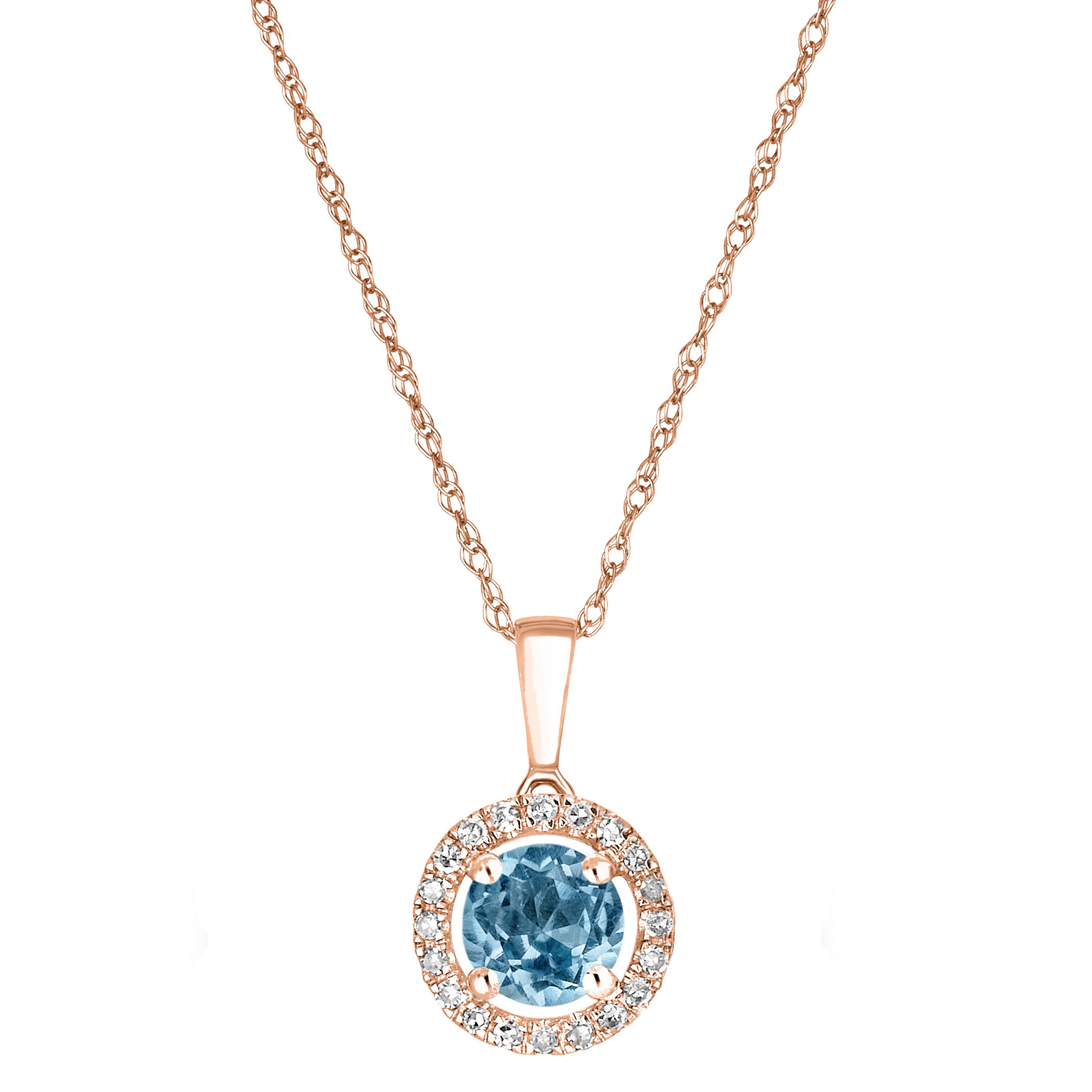Vibrant Swiss blue topaz is surrounded by sparkling diamonds in this stunning rose gold necklace.• 5mm Round Swiss Blue Topaz Gemstone• 14K Rose Gold Setting • Diamond Accents• 18" Rope Chain With Spring Lock• Semi Precious Birthstone Collection