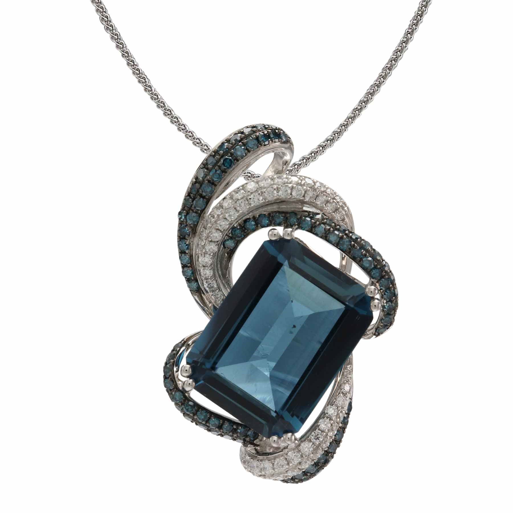 - 14K WHITE GOLD DIAMOND, TREATED BLUE DIAMOND AND LONDON BLUE TOPAZ PENDANT WITH CHAIN