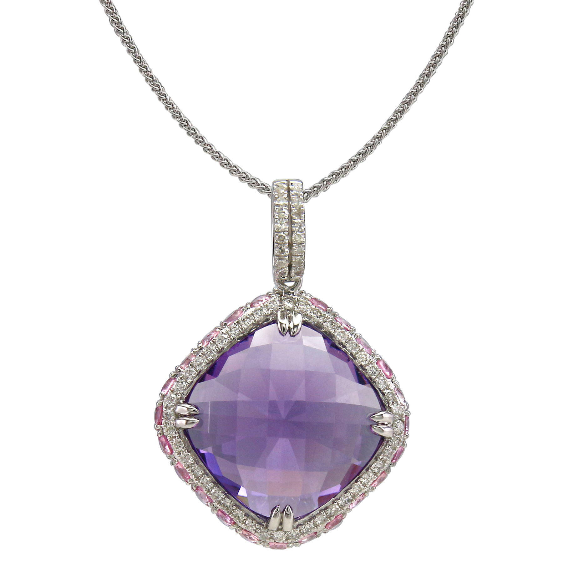 14K WHITE GOLD DIAMOND, PINK SAPPHIRE AND AMETHYST PENDANT WITH CHAIN