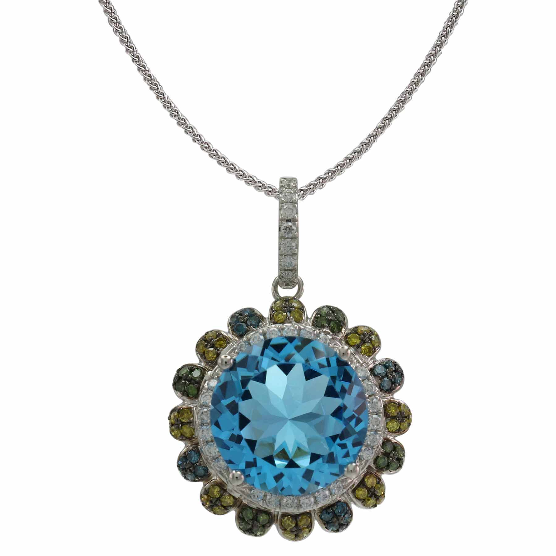 14K WHITE GOLD MULTICOLOR DIAMOND AND SWISS BLUE TOPAZ PENDANT WITH CHAIN